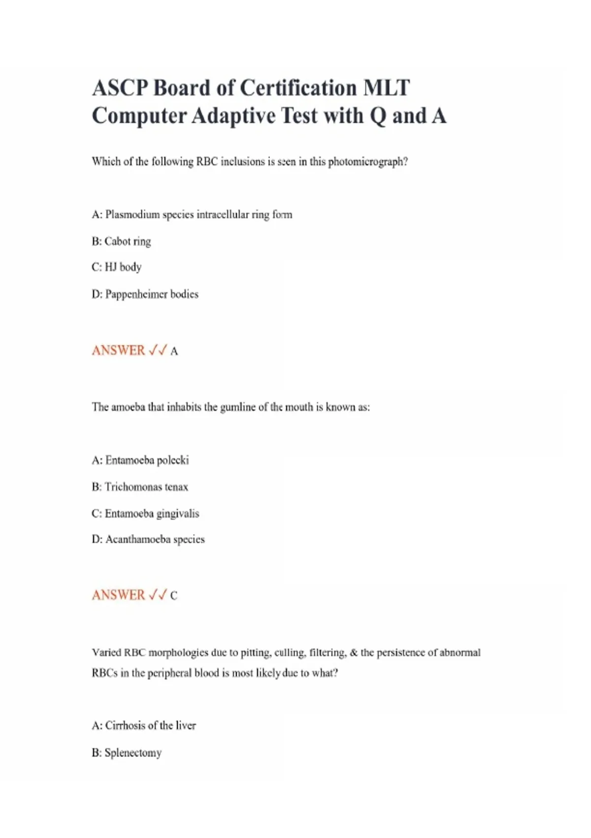 ASCP Board of Certification MLT Computer Adaptive Test with Q and A Which of the following RBC inclusions is seen in this photomicrograph? A: Plasmodium species intracellular ring form B: Cabot ring C: HJ body D: Pappenheimer bodies ANSWER A The amoeba that inhabits the gumline of the mouth is known as: A: Entamoeba polecki B: Trichomonas tenax C: Entamoeba gingivalis D: Acanthamoeba species ANSWER C Varied RBC morphologies due to pitting, culling, filtering, & the persistence of abnormal RBCs in the peripheral blood is most likely due to what? A: Cirrhosis of the liver B: Splenectomy C: Incompatible D: Autosomal recessive trait ANSWER B