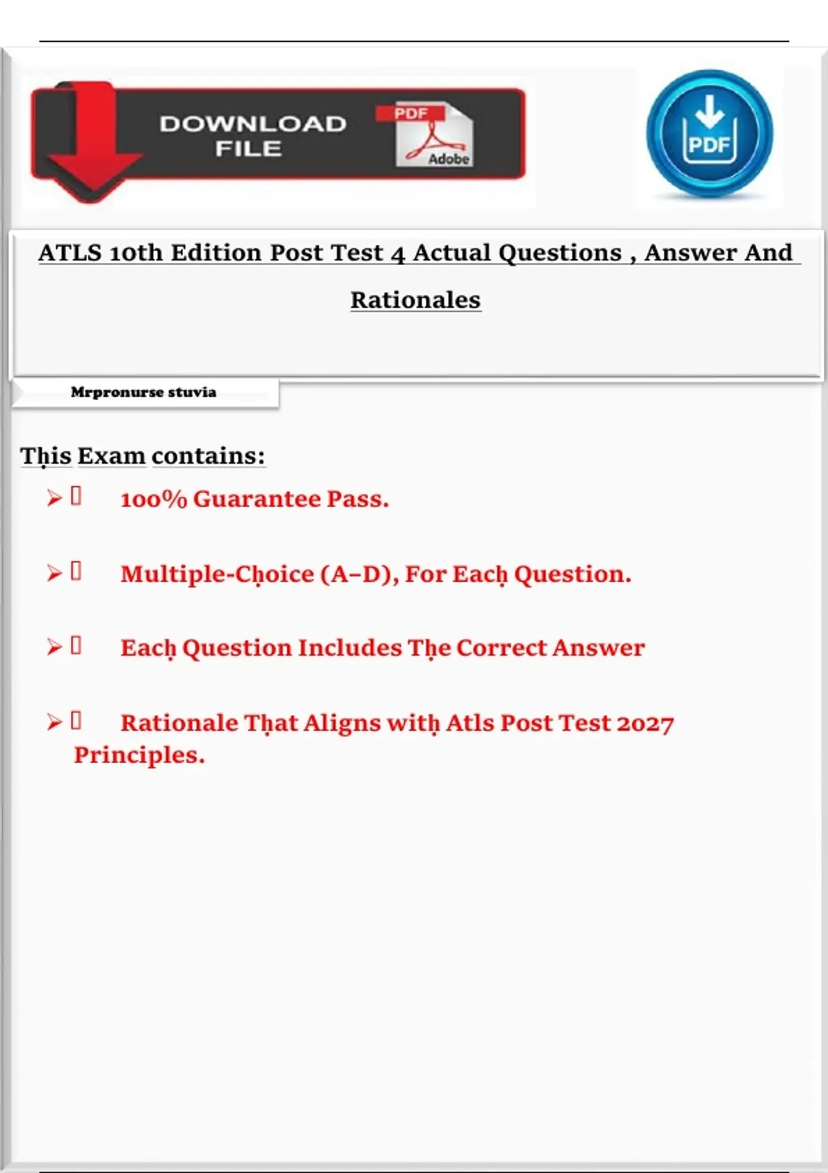 This document provides the complete ATLS (Advanced Trauma Life Support) 10th Edition Post Test 4 with multiple-choice questions, correct answers, and detailed rationales aligned with ATLS 2027 principles. Topics include airway management, shock and hemorrhage control, traumatic brain injury, chest trauma, obstetric and pediatric trauma, frostbite, compartment syndrome, and burn care. It is designed as a practice exam resource to prepare students and professionals for ATLS certification and recertification.