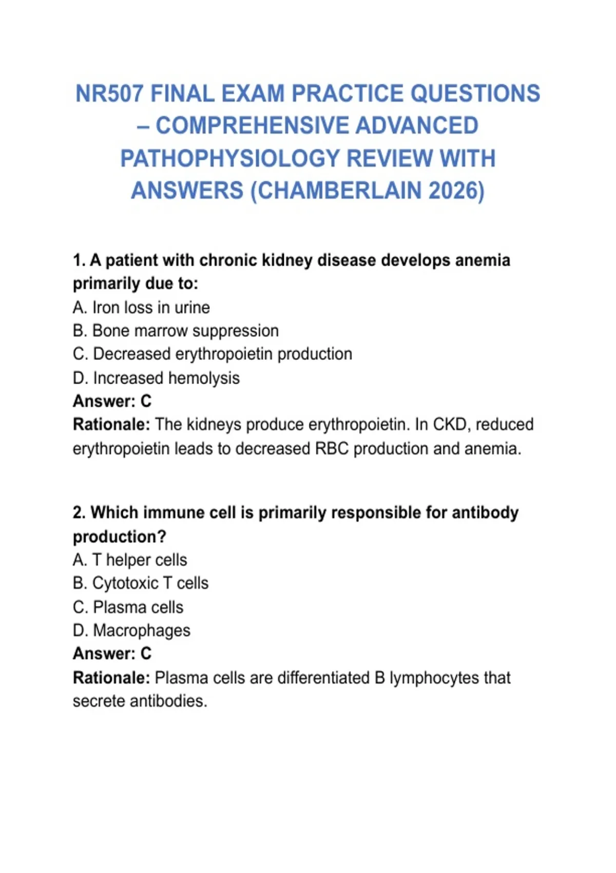 NR507 FINAL EXAM PRACTICE QUESTIONS – COMPREHENSIVE ADVANCED PATHOPHYSIOLOGY REVIEW WITH ANSWERS (CHAMBERLAIN 2026)