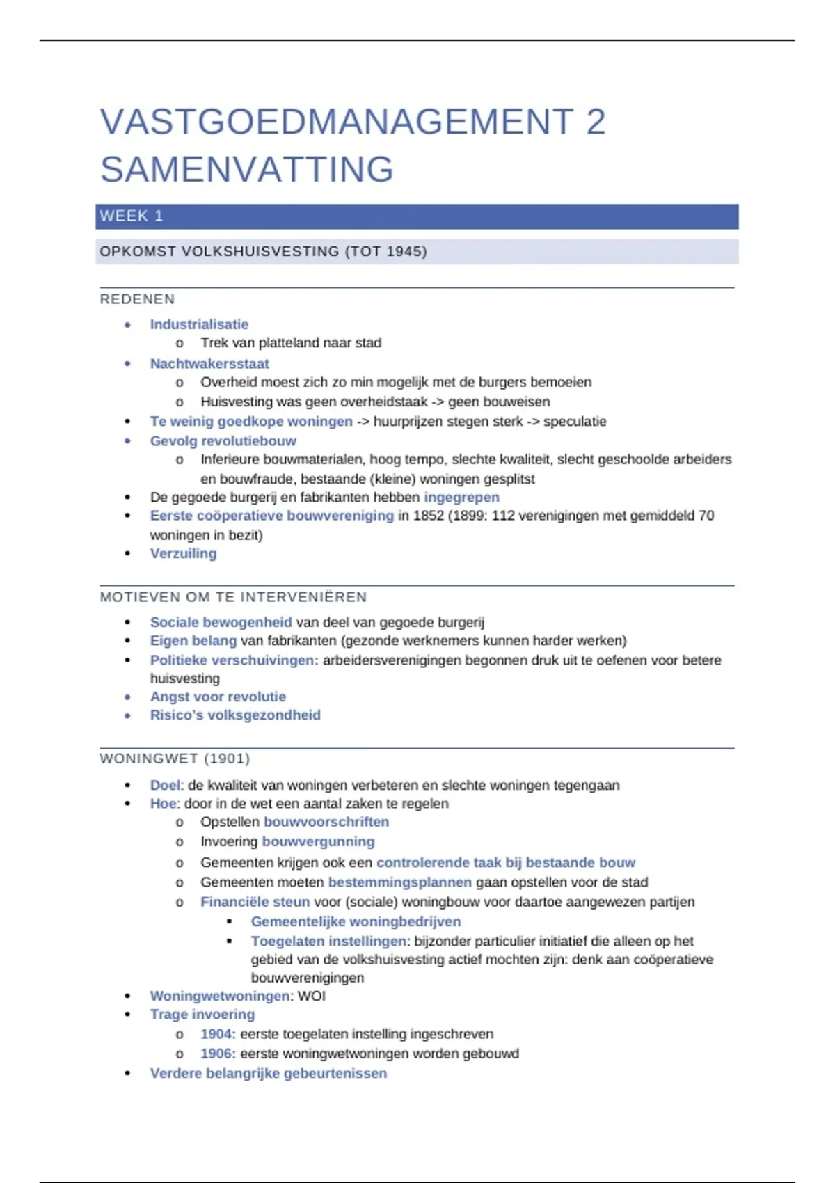 In deze samenvatting wordt de inhoud van het vak "Vastgoedkunde 2" van de hbo studie Vastgoedkunde per week omschreven. Deze samenvatting biedt een duidelijke basis voor het tentamen, waarbij de focus ligt op onderwerpen als huur, koop, en woningcorporaties.