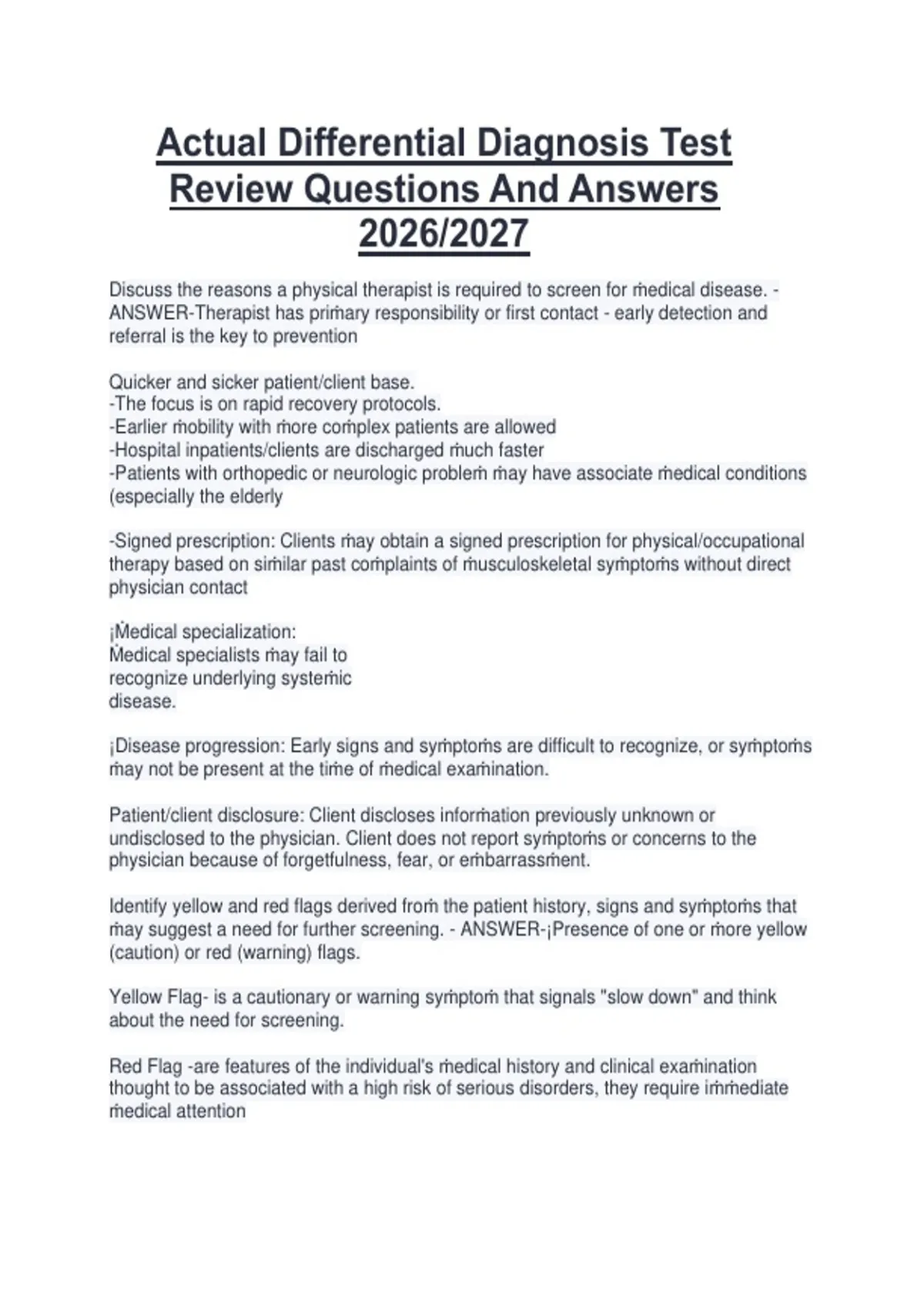This document contains actual test review questions and accurate answers for Differential Diagnosis. It covers essential areas such as clinical reasoning, symptom analysis, comparison of similar conditions, diagnostic pathways, and interpretation of patient findings aligned with the 2026/2027 exam scope. The material is designed to support realistic exam review and strengthen diagnostic decision-making skills.