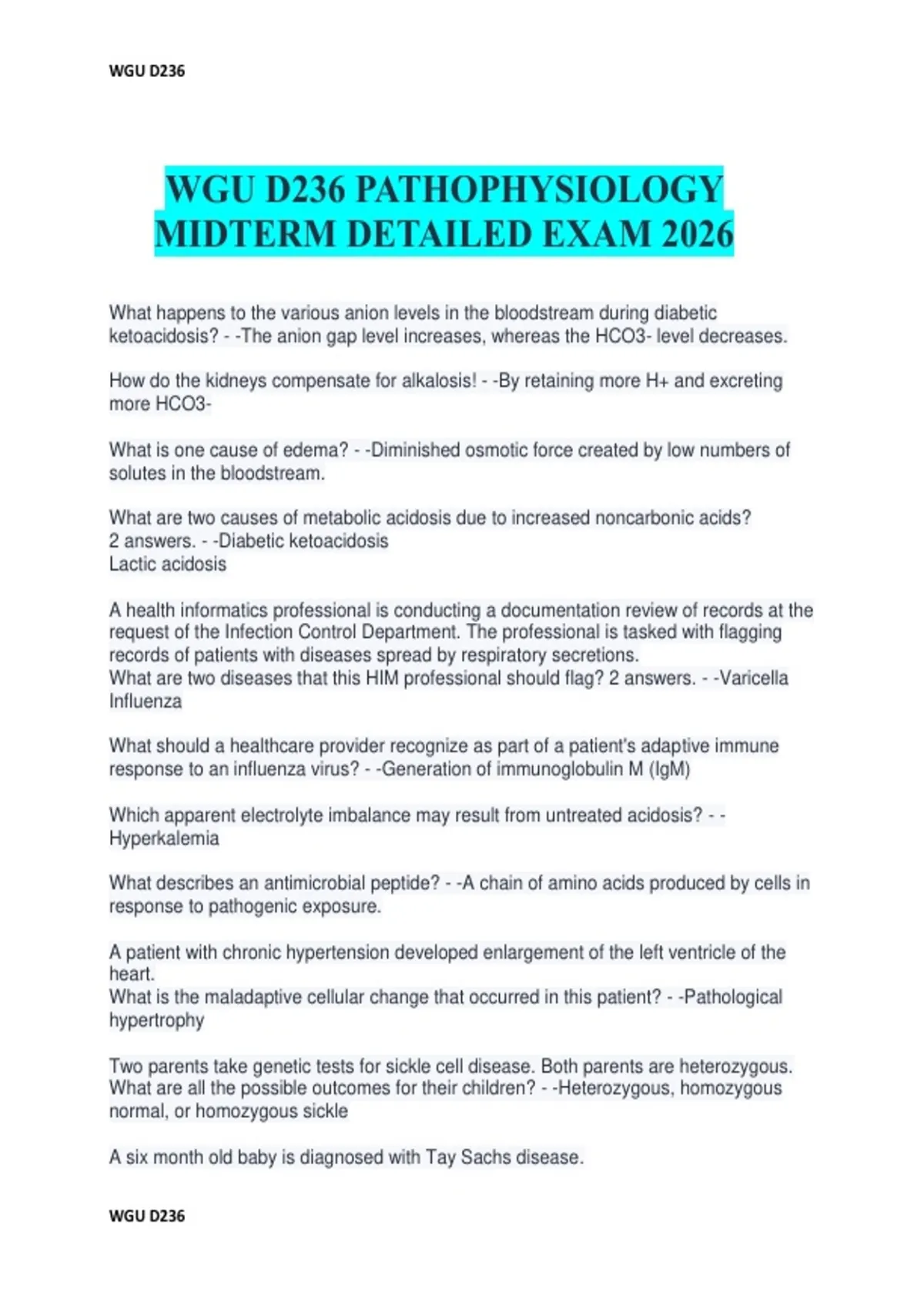 WGU D236 PATHOPHYSIOLOGY MIDTERM DETAILED EXAM 2026 What happens to the various anion levels in the bloodstream during diabetic ketoacidosis? - -The anion gap level increases, whereas the HCO3- level decreases. How do the kidneys compensate for alkalosis! - -By retaining more H+ and excreting more HCO3- What is one cause of edema? - -Diminished osmotic force created by low numbers of solutes in the bloodstream. What are two causes of metabolic acidosis due to increased noncarbonic acids? 2 answers. - -Diabetic ketoacidosis Lactic acidosis A health informatics professional is conducting a documentation review of records at the request of the Infection Control Department. The professional is tasked with flagging records of patients with diseases spread by respiratory secretions. What are two diseases that this HIM professional should flag? 2 answers. - -Varicella Influenza What should a healthcare provider recognize as part of a patient's adaptive immune response to an influenza virus? - -Generation of immunoglobulin M (IgM) Which apparent electrolyte imbalance may result from untreated acidosis? - Hyperkalemia What describes an antimicrobial peptide? - -A chain of amino acids produced by cells in response to pathogenic exposure. A patient with chronic hypertension developed enlargement of the left ventricle of the heart. What is the maladaptive cellular change that occurred in this patient? - -Pathological hypertrophy Two parents take genetic tests for sickle cell disease. Both parents are heterozygous. What are all the possible outcomes for their children? - -Heterozygous, homozygous normal, or homozygous sickle A six month old baby is diagnosed with Tay Sachs disease. WGU D236 WGU D236 Which developmental disruptions are associated with this disorder? - -Lethargy, muscle flaccidity, motor coordination impairment, and increasing cognitive impairment. Which fracture type is it when there is more than one fracture line, and more than two bone fragments are shattered or crushed? - -Comminuted What are two characteristics of osteoarthritis as opposed to rheumatoid arthritis? 2 answers - -The pathophysiology includes joint swelling and osteophyte formation. The most commonly affected joints are the knee, hip, hand, and proximal interphalangeal and distal interphalangeal joints. A healthcare professional examines a patient with a slow growing, small, dome shaped bump on the nose. The lesion is shiny, translucent, and pearly in appearance. Which type of lesion should this healthcare professional be concerned about? - -Basal cell carcinoma The record of a 35 year old woman contains the following information: Presentation: Sudden, transient motor and sensory disturbances, impaired vision, muscle weakness, and balance problems. Diagnostic work up including neurological exam, CT, MRI, and CSF analysis. The patient's diagnosis is a chronic, autoimmune, progressive, and irreversible disease characterized by the destruction of the myelin sheath. Which condition does this patient have? - -Multiple sclerosis A patient presents with ringing in the ears, vomiting, and a severe headache after playing football and taking a hard tackle. A CT scan shows that blood had accumulated in the surrounding brain tissue. Which diagnosis is described? - -Cerebral contusion What is the pathogenesis of multiple sclerosis? - -Damage to the myelin of the peripheral nervous system. What are two characteristics of a transient ischemic attack? 2 answers - -Focal deficits resolve in less than 24 hours. Symptoms last for minutes to hours. What is a cerebrovascular accident marked by a blockage of blood flow due to a rupture in a cerebral vessel? - -Hemorrhagic stroke Which two risk factors are associated with hypertension? 2 answers - -Obesity and Diabetes Mellitus What are two predisposing factors to deep venous thromboembolism? 2 answers - -Hyper-coagulability Vascular damage WGU D236 WGU D236 What are two parts of the pathophysiology of DVT? 2 answers - -A thrombus forms at an area of inflammation. A thrombus develops in a lower extremity. A patient presents with racing of the heart, palpitations, and shortness of breath. The patient's heart rate was 130. Which diagnosis is indicated by this description? - -Atrial fibrillation What is a characteristic of aneurysms? - -Hypertension is a risk factor for aneurysm formation. What is a clot or undissolved mass that is carried through the circulatory vessels by blood or lymph flow? - -Embolus A patient's record shows chronic blood loss anemia. Which form of anemia does this indicate? - -Iron deficiency anemia Which is this type of anemia? Occurs when there are inadequate reserves of iron in the body. - -Iron deficiency anemia Which is this type of anemia? Occurs when there are inadequate stores of folic acid. - -Folic acid deficiency anemia Which is this type of anemia? Occurs when there are inadequate levels of B12. - -Pernicious anemia Which is this type of anemia? Occurs when there is insufficient or totally absent red blood cell production. - -Aplastic anemia Which disorder is characterized by the development of binucleate Reed Sternberg cells? - -Hodgkin's lymphoma What are two of the symptoms of SLE? 2 answers - -Fatigue and fever A patient is receiving treatment for Hodgkin disease. What is a possible complication of the treatment for Hodgkin disease? - -A weakened immune system WGU D236 WGU D236 Which two conditions are considered as inflammation of the upper respiratory tract? 2 answers - -Pharyngitis and croup What are two signs of a pneumothorax? 2 answers - -Dyspnea and intercostal muscle retractions. Which pathophysiological characteristic is associated with pneumonia? - -Exudates filling the air spaces of alveoli. What are two common causes of an obstruction in the large intestine? 2 answers - -A cancerous mass Benign polyps On physical examination, a patient is noted to have pallor, ascites, cachexia, and hepatomegaly. On history, the patient complained of alternati