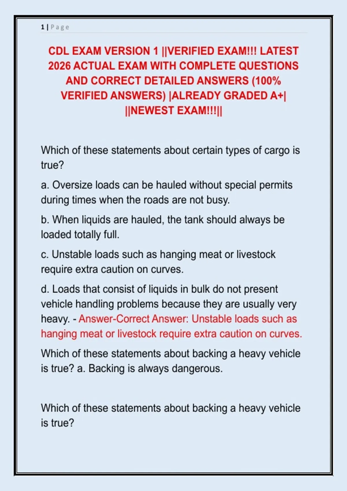 CDL EXAM VERSION 1 ||VERIFIED EXAM!!! LATEST