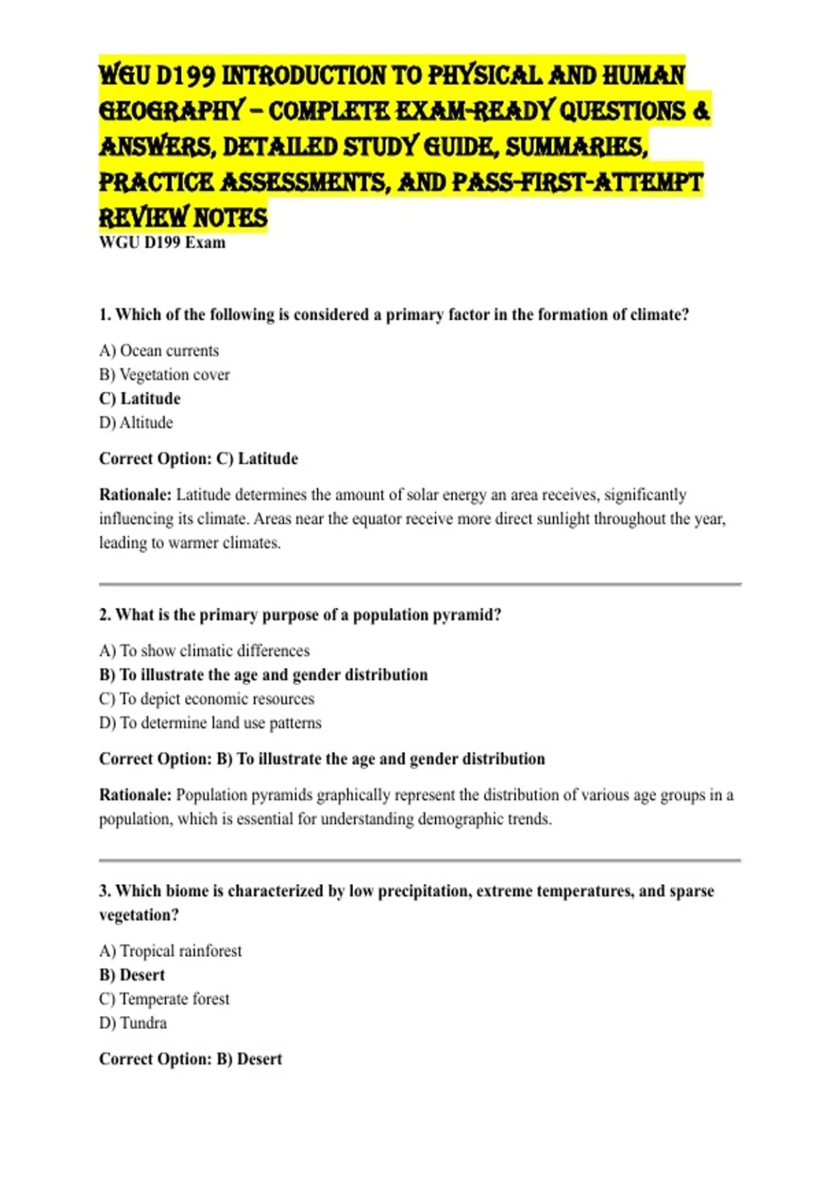 This WGU D199 Introduction to Physical and Human Geography study document is a comprehensive, exam-focused resource designed to help students confidently pass the WGU Objective Assessment on the first attempt. It features clearly structured questions and answers, simplified explanations of physical geography concepts such as climate, landforms, ecosystems, and weather patterns, alongside human geography topics including population, culture, urbanization, globalization, and economic systems. The content is aligned with WGU competency-based learning objectives, making it ideal for fast-track learners who want clear summaries, practical examples, and exam-relevant insights without unnecessary fluff. Perfect for last-minute revision or full-course mastery, this document saves time, boosts understanding, and increases exam confidence—making it a must-have resource for any WGU D199 student aiming to pass efficiently and stress-free.
