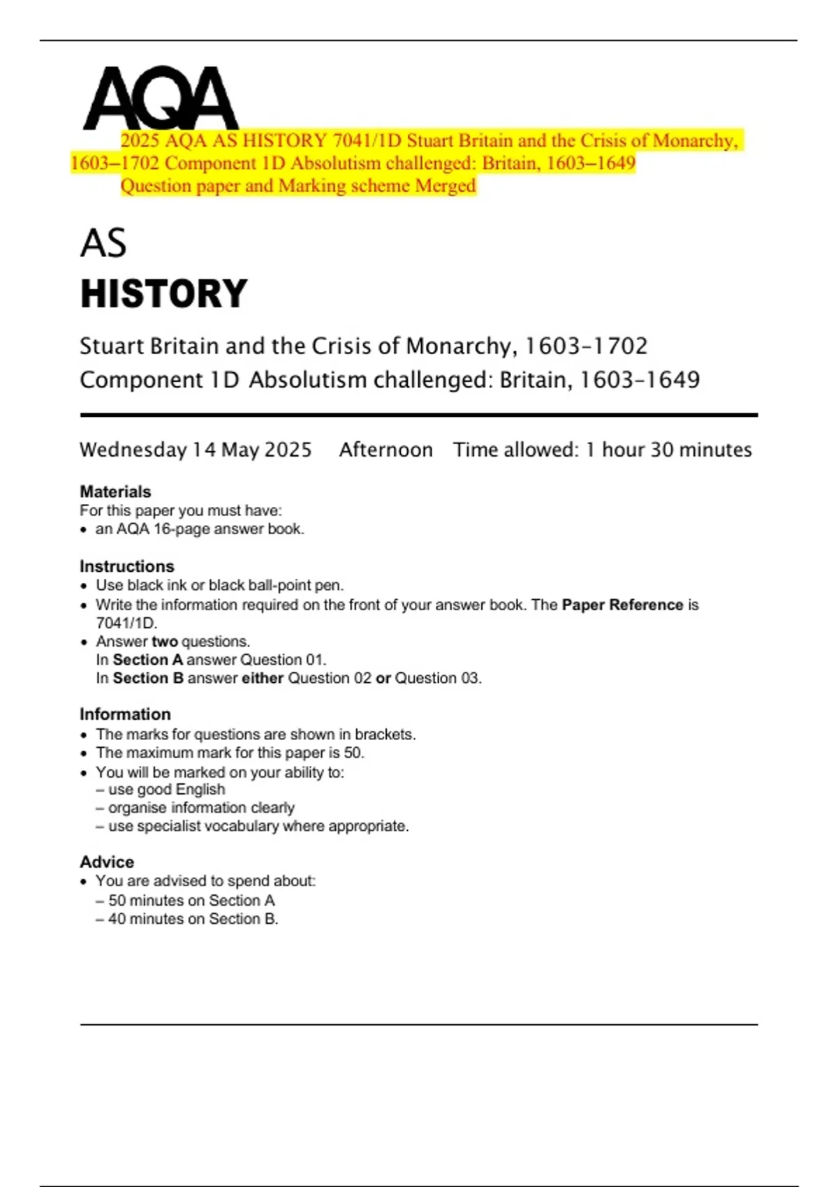 • The maximum mark for this paper is 50.