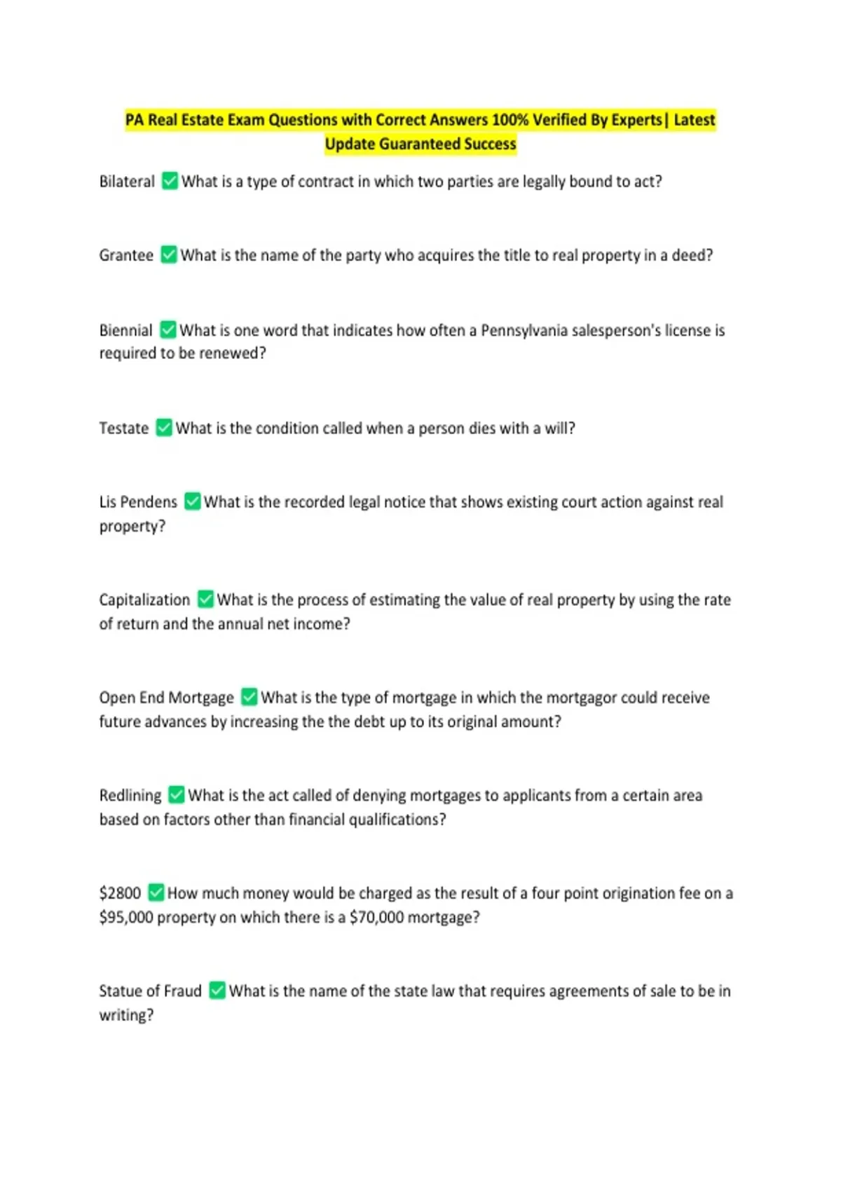 PA Real Estate Exam Questions with Correct Answers 100% Verified By Experts| Latest