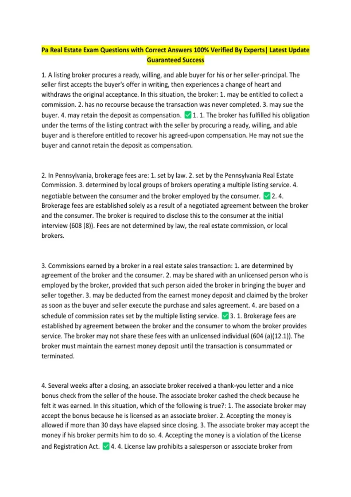 Pa Real Estate Exam Questions with Correct Answers 100% Verified By Experts| Latest Update