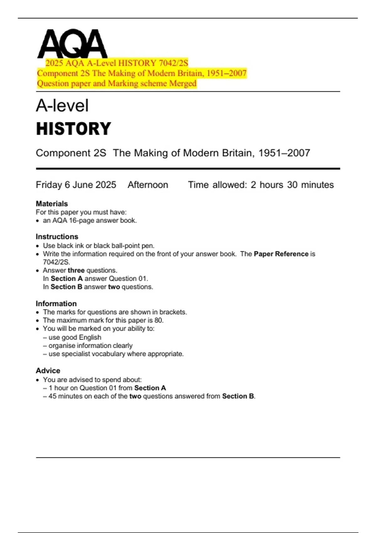 2025 AQA A-Level HISTORY 7042/2S Component 2S The Making of Modern Britain, 1951–2007 Question paper and Marking scheme Merged