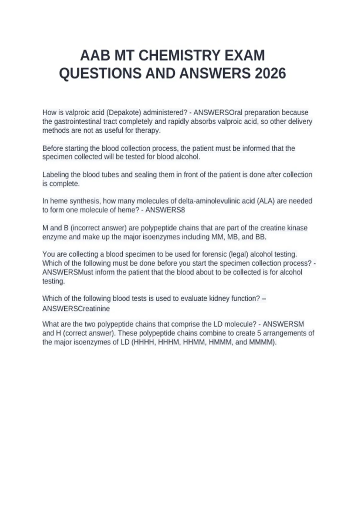 How is valproic acid (Depakote) administered? - ANSWERSOral preparation because the gastrointestinal tract completely and rapidly absorbs valproic acid, so other delivery methods are not as useful for therapy. Before starting the blood collection process, the patient must be informed that the specimen collected will be tested for blood alcohol. Labeling the blood tubes and sealing them in front of the patient is done after collection is complete. In heme synthesis, how many molecules of delta-aminolevulinic acid (ALA) are needed to form one molecule of heme? - ANSWERS8 M and B (incorrect answer) are polypeptide chains that are part of the creatine kinase enzyme and make up the major isoenzymes including MM, MB, and BB. You are collecting a blood specimen to be used for forensic (legal) alcohol testing.