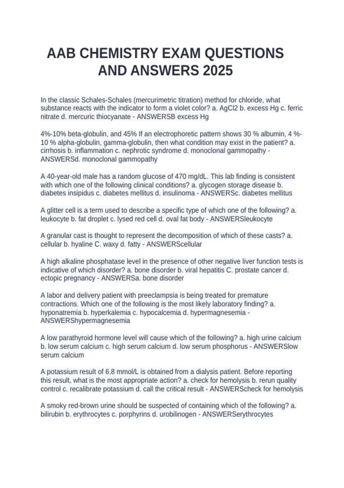 In the classic Schales-Schales (mercurimetric titration) method for chloride, what substance reacts with the indicator to form a violet color? a. AgCl2 b. excess Hg с. ferric nitrate d. mercuric thiocyanate - ANSWERSB excess Hg 4%-10% beta-globulin, and 45% If an electrophoretic pattern shows 30 % albumin, 4 %-10 % alpha-globulin, gamma-globulin, then what condition may exist in the patient? a. cirrhosis b. inflammation c. nephrotic syndrome d. monoclonal gammopathy - ANSWERSd. monoclonal gammopathy A 40-year-old male has a random glucose of 470 mg/dL. This lab finding is consistent with which one of the following clinical conditions? a. glycogen storage disease b. diabetes insipidus c. diabetes mellitus d. insulinoma - ANSWERSc. diabetes mellitus A glitter cell is a term used to describe a specific type of which one of the following? a. leukocyte b. fat droplet c. lysed red cell d. oval fat body - ANSWERSleukocyte A granular cast is thought to represent the decomposition of which of these casts? a. cellular b. hyaline C. waxy d. fatty - ANSWERScellular A high alkaline phosphatase level in the presence of other negative liver function tests is indicative of which disorder? a. bone disorder b. viral hepatitis C. prostate cancer d. ectopic pregnancy - ANSWERSa. bone disorder