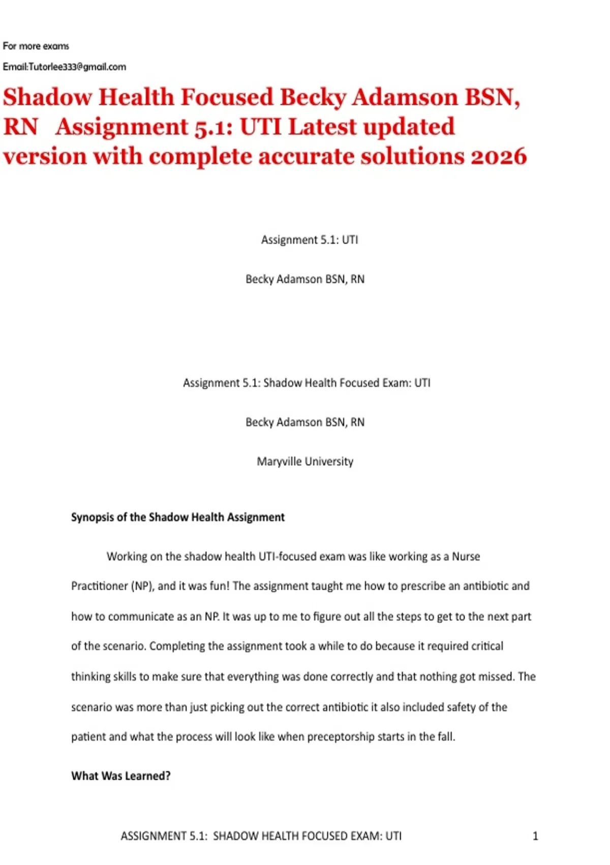 Shadow Health Focused | Becky Adamson BSN, RN | Assignment 5.1: UTI |Latest updated version with complete accurate solutions 2026