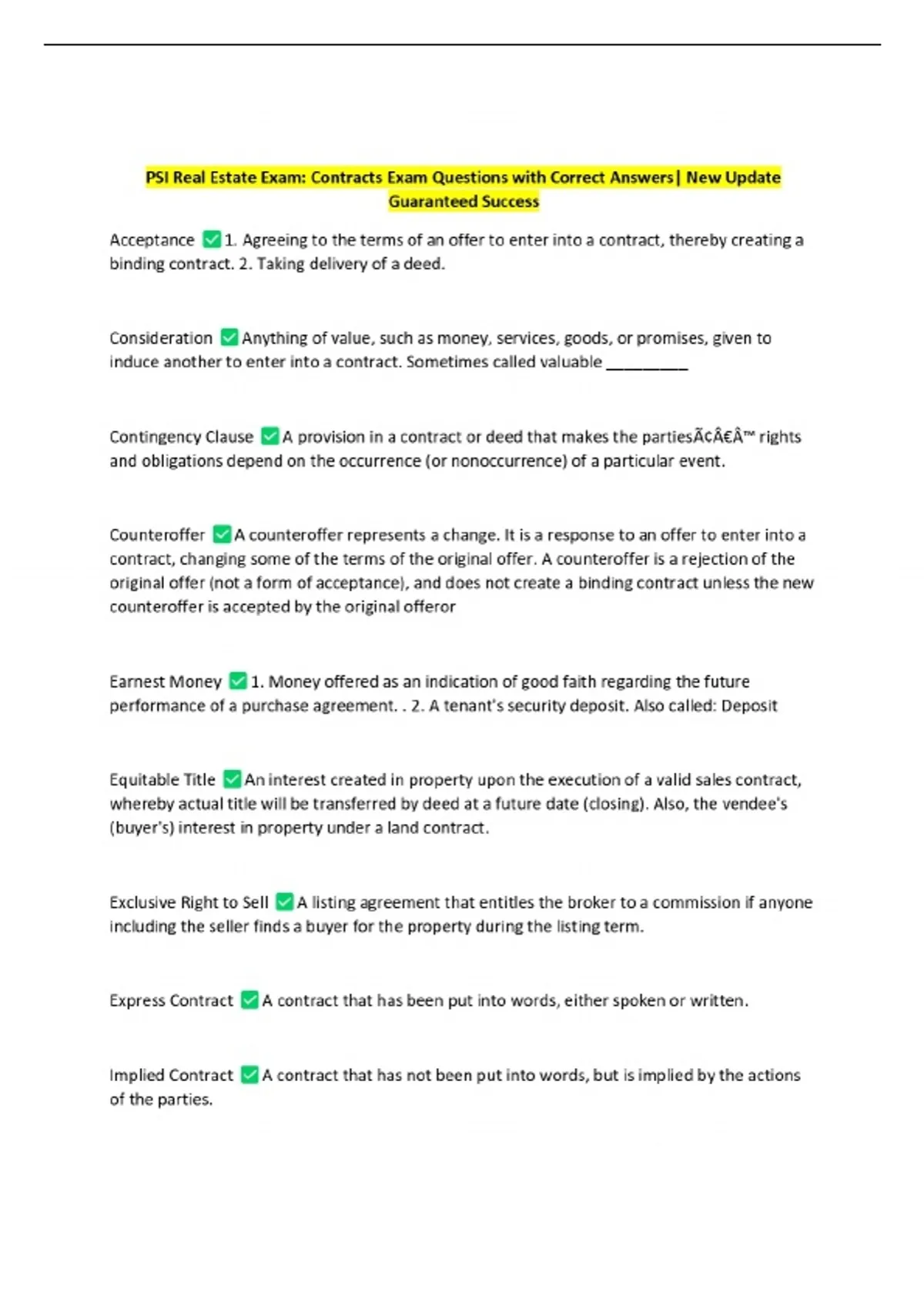 PSI Real Estate Exam: Contracts Exam Questions with Correct Answers| New Update Guaranteed Success