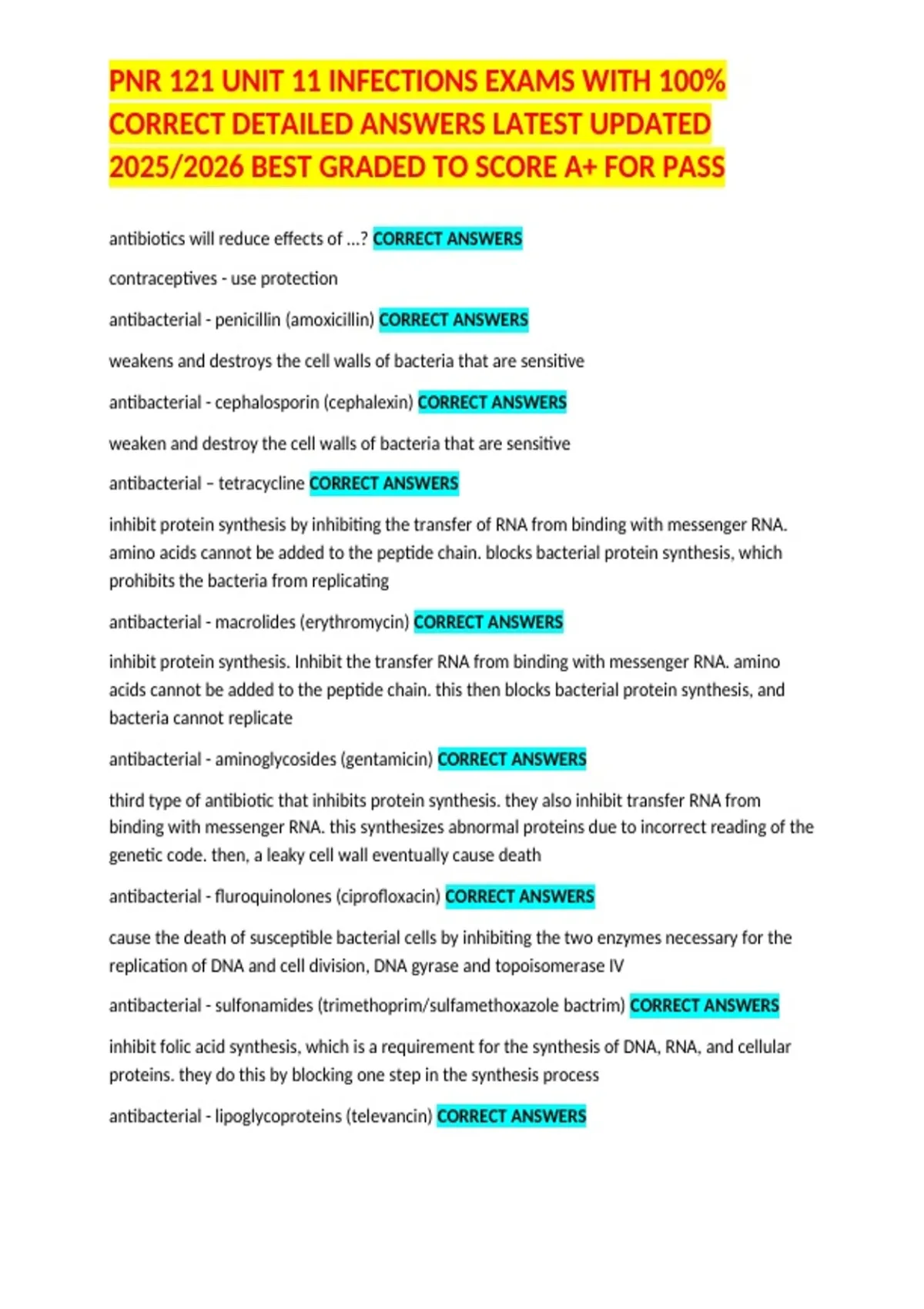 , PNR 121 UNIT 11 INFECTIONS EXAMS WITH 100%