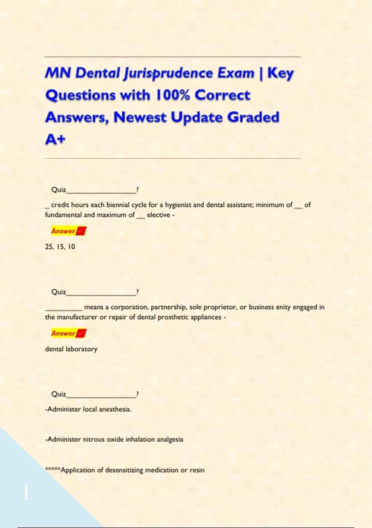 MN Dental Jurisprudence Exam | Key Questions with 100% Correct Answers, Newest Update Graded A+