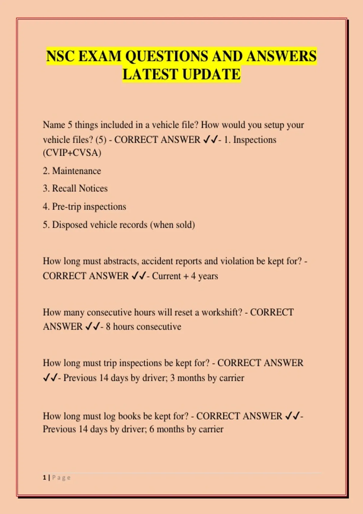 National Safety Code (NSC) Exam Prep Guide – Questions & Verified Answers | Canada Commercial Driver Licensing & Logbook Rules Prepare for your Canadian National Safety Code (NSC) exam with this complete study guide containing the latest questions and verified answers. This essential resource covers all key topics required for commercial drivers and carriers, including Hours of Service (Cycle 1 & 2), logbook requirements, pre-trip inspections, accident reporting, driver qualification files, carrier safety plans, documentation retention periods, and Transportation of Dangerous Goods (TDG) responsibilities. Designed for Class 1 drivers, fleet managers, and transportation professionals seeking NSC certification or compliance, this guide provides clear, practical Q&As to help you understand regulations, avoid violations, and ensure road safety.
