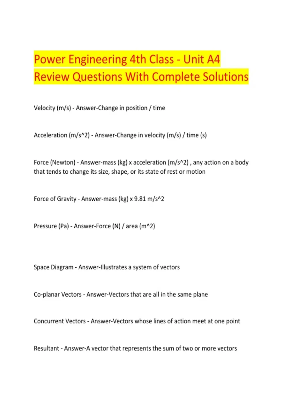 Power Engineering 4th Class - Unit A4 Review Questions With Complete Solutions