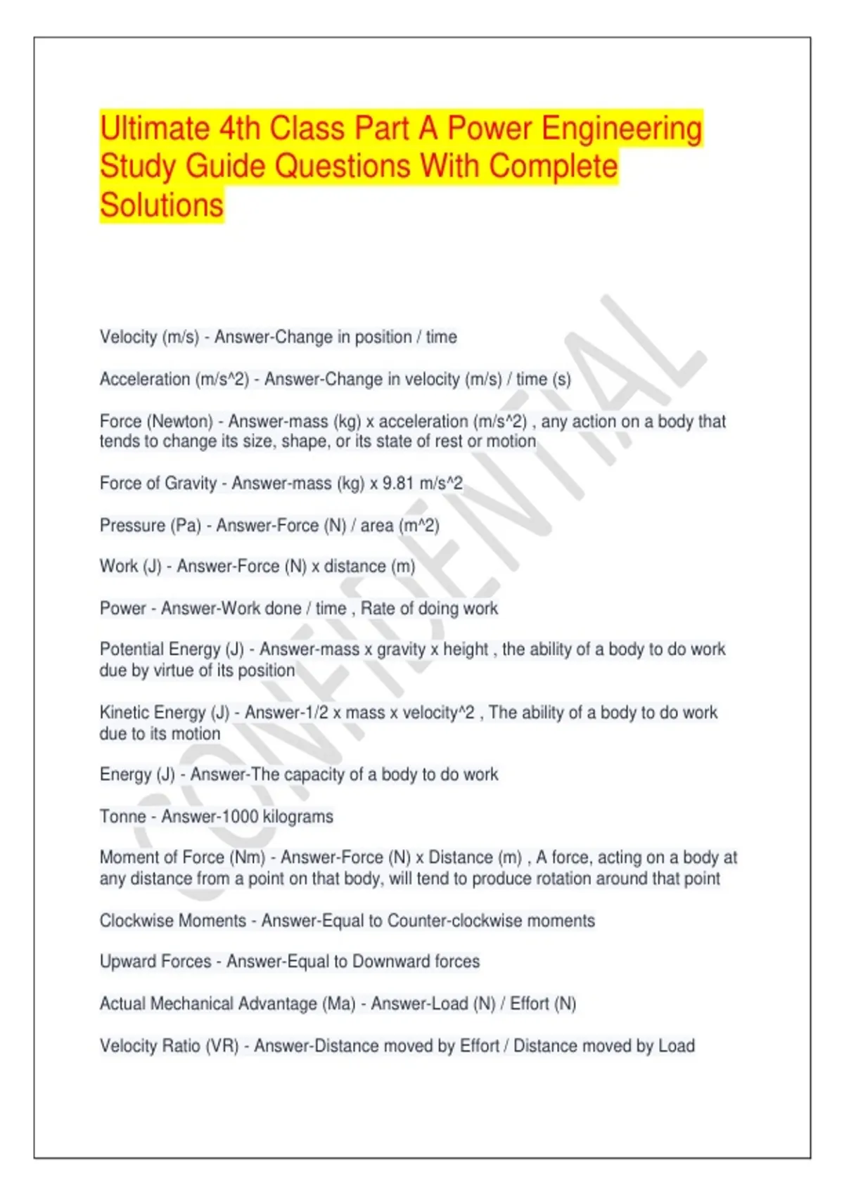 Potential Energy (J) - Answer-mass x gravity x height , the ability of a body to do work