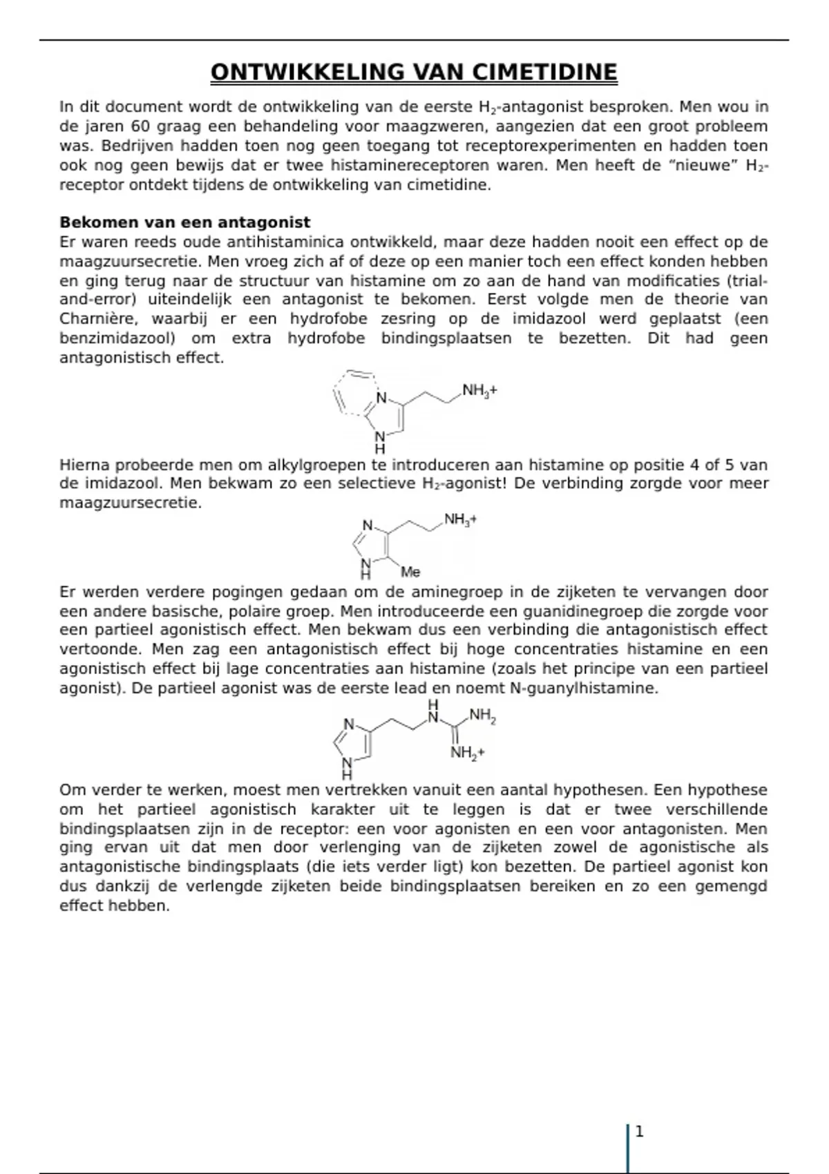 Dit kleine document bevat alle informatie over de ontwikkeling van cimetidine, zoals besproken in de les van prof. Van Calenbergh. Alle aanpassingen van de structuur zijn aanwezig en alles is uitgebreid uitgelegd in uitgeschreven tekst met alle nodige afbeeldingen. Dit is een deel van de samenvatting Medicinale Chemie die ook verkrijgbaar is op Stuvia.