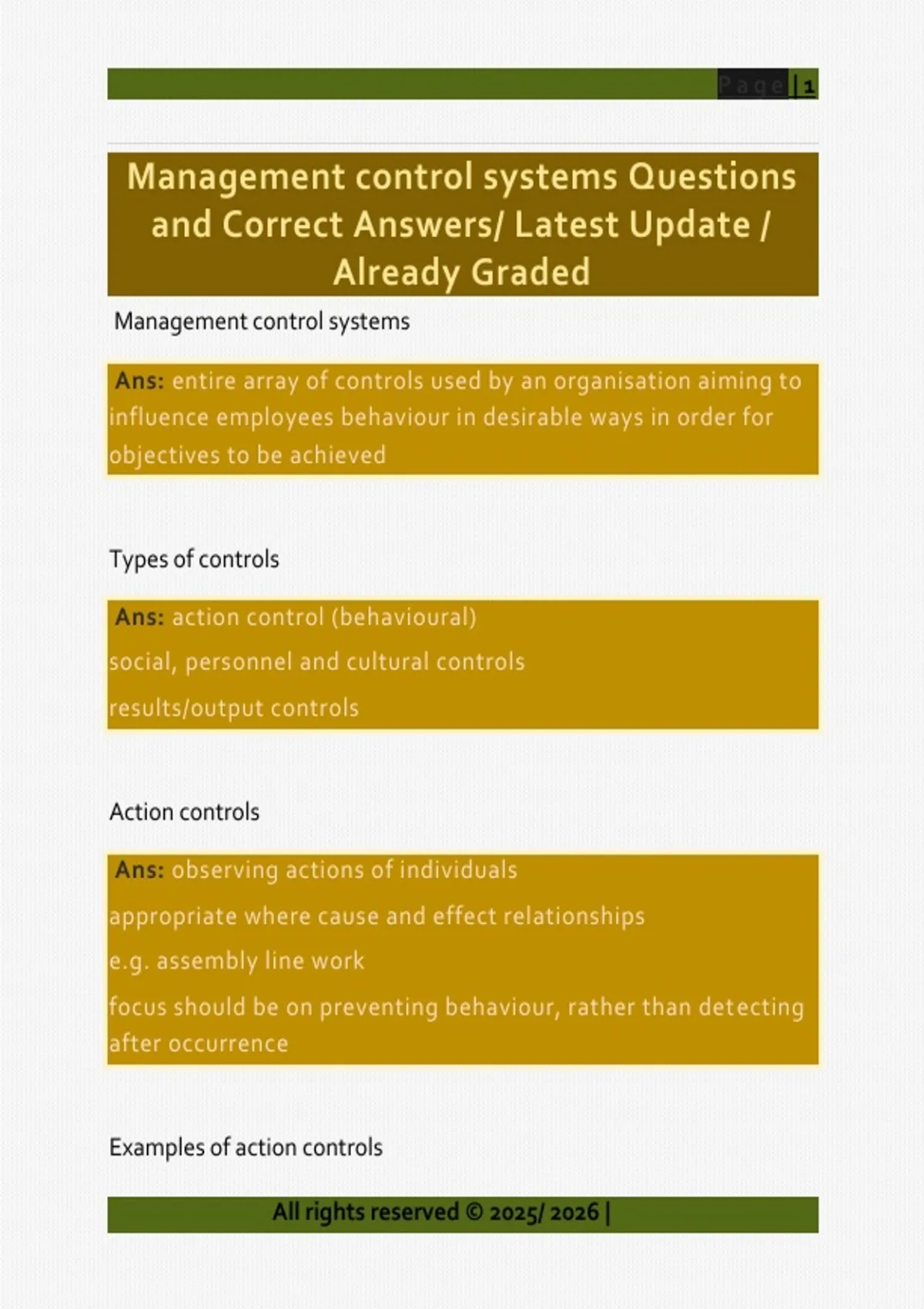 Management control systems Questions and Correct Answers/ Latest Update / Already Graded