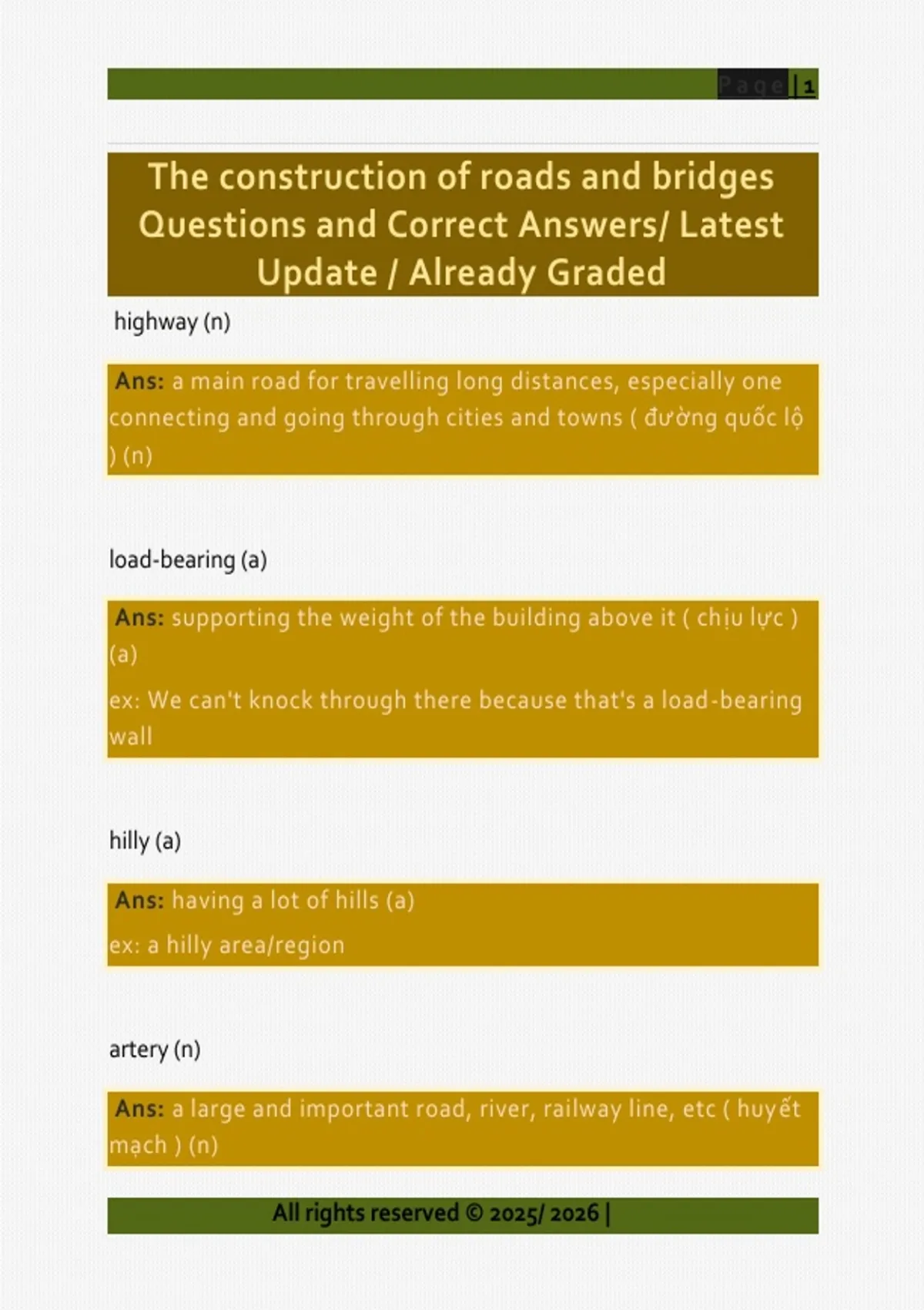 The construction of roads and bridges Questions and Correct Answers/ Latest Update / Already Graded