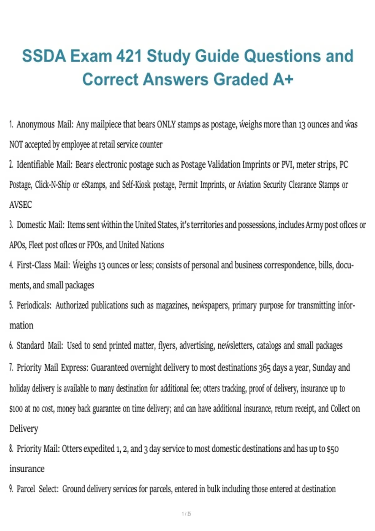This study guide contains exam-focused questions with fully verified correct answers for the SSDA/SSA Academy USPS Exam 421 (Window Clerk). It covers all major testing areas including customer service standards, postal products and services, retail window operations, mail acceptance and processing, financial transactions, safety procedures, and USPS rules and regulations, aligned with the 2026/2027 USPS exam requirements.