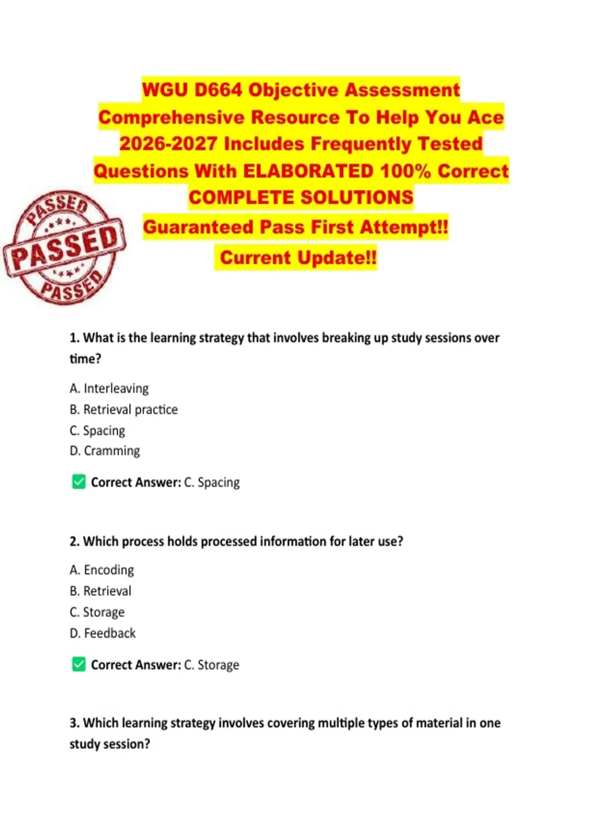 WGU D664 Objective Assessment Comprehensive Resource To Help You Ace Includes Frequently Tested Questions With ELABORATED 100% Correct COMPLETE SOLUTIONS Guaranteed Pass First Attempt!! Current Update!! 1. What is the learning strategy that involves breaking up study sessions over time? A. Interleaving B. Retrieval practice C. Spacing D. Cramming Correct Answer: C. Spacing 2. Which process holds processed information for later use? A. Encoding B. Retrieval C. Storage D. Feedback Correct Answer: C. Storage 3. Which learning strategy involves covering multiple types of material in one study session? A. Spacing B. Interleaving C. Retrieval practice D. Feedback Correct Answer: B. Interleaving 4. What process transforms sensory input into meaningful information? A. Storage B. Retrieval C. Encoding D. Feedback Correct Answer: C. Encoding 5. Accessing information that is already stored in memory is called: A. Encoding B. Storage C. Retrieval D. Metacognition Correct Answer: C. Retrieval 6. Which learning strategy refers to intentionally remembering stored information? A. Spacing B. Feedback C. Interleaving D. Retrieval practice Correct Answer: D. Retrieval practice 7. Students quiz each other before an exam. Which learning strategy is being demonstrated? A. Spacing B. Interleaving C. Retrieval practice D. Feedback Correct Answer: C. Retrieval practice 8. What concept contradicts the myth of multitasking? A. Cognitive styles B. Limited brain capacity C. Embodied mind D. Neuroplasticity Correct Answer: B. Limited brain capacity 9. What serves as evidence that multitasking is not a beneficial learning habit? A. Improved attention span B. Faster memory recall C. Impaired decision-making D. Enhanced executive function Correct Answer: C. Impaired decision-making 10. What directly contradicts the myth of cramming? A. Learning styles differ B. Memory is genetically determined C. The brain needs time to combine and process information D. Intelligence is fixed Correct Answer: C. The brain needs time to combine and process information