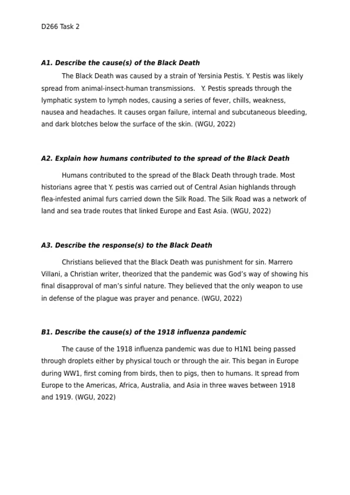 D266 Task 2: Causes and Responses to the Black Death and the 1918 Influenza
