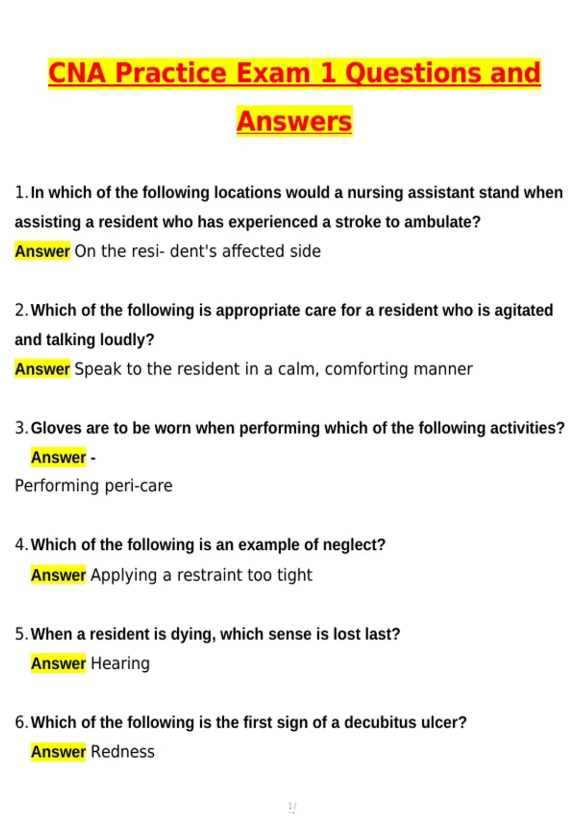 CNA Practice Exam 1 Latest 2026 Actual Questions and Verified Answers (Latest 2026 / 2027 Update) A+ Grade 100% Guarantee Verified by Experts