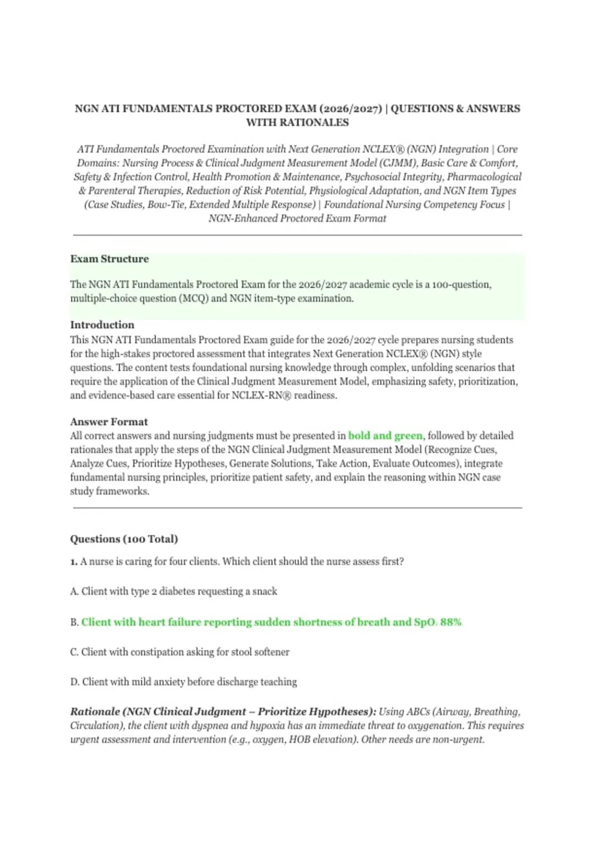 This NGN-enhanced ATI Fundamentals proctored exam review covers essential nursing competencies, including the nursing process and Clinical Judgment Measurement Model (CJMM), basic care and comfort, safety and infection control, health promotion, psychosocial integrity, pharmacological and parenteral therapies, reduction of risk potential, and physiological adaptation. The document includes NGN-style item types such as case studies, bow-tie questions, and extended multiple response items, all with clear answers and rationales to support Next Generation NCLEX® readiness and foundational nursing success.