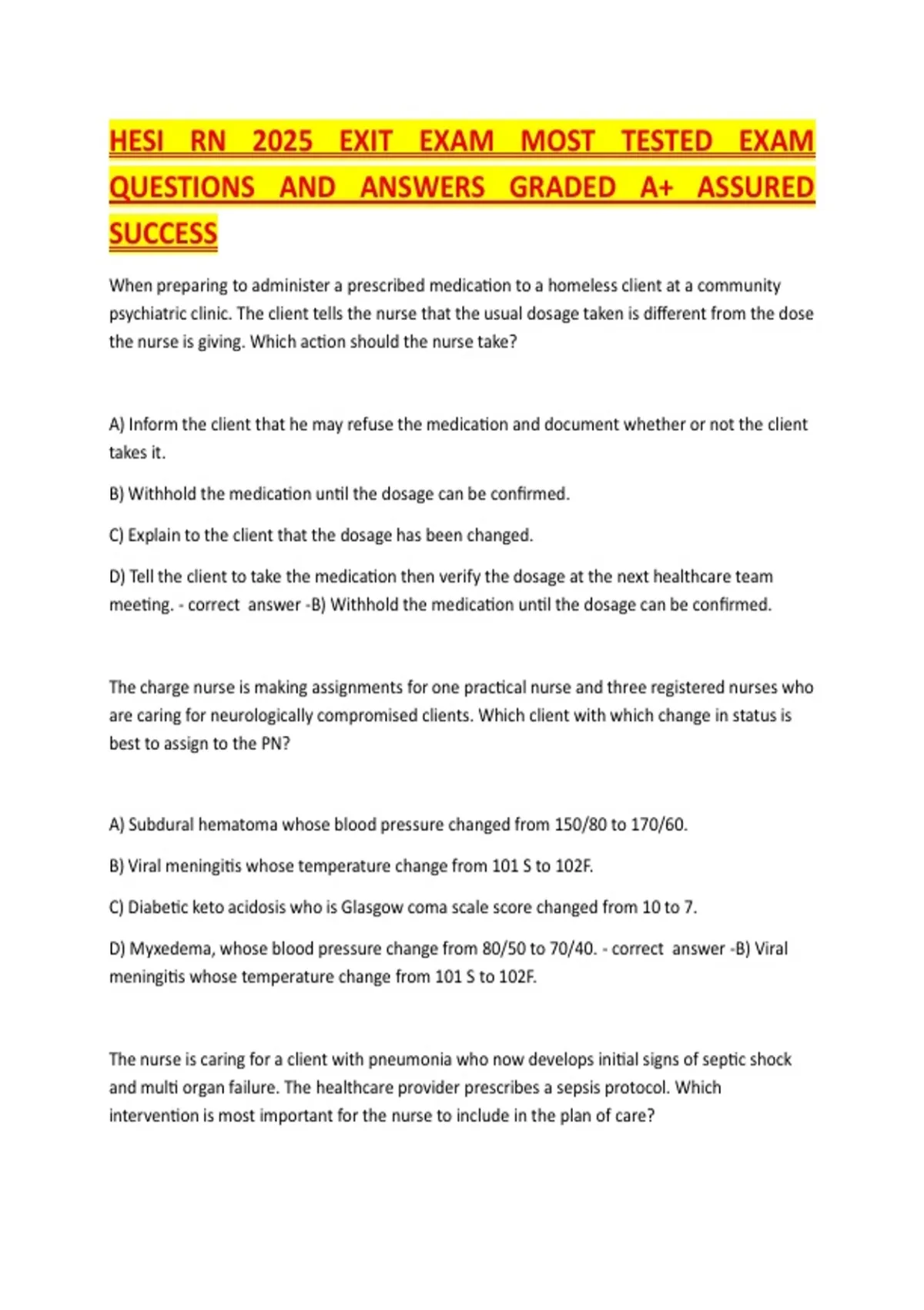HESI RN 2025 EXIT EXAM MOST TESTED EXAM QUESTIONS AND ANSWERS GRADED A+ ASSURED SUCCESS