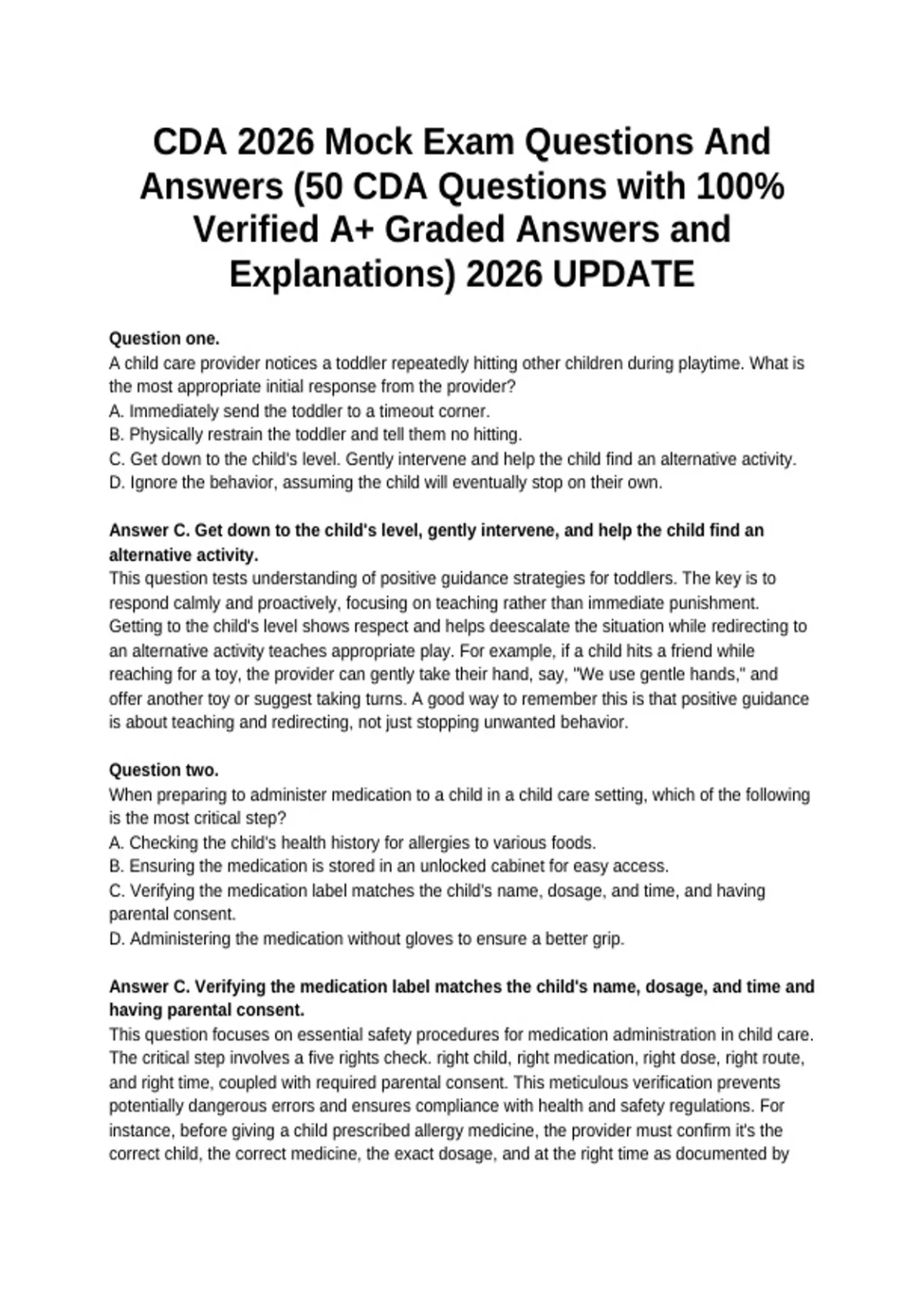 This document features a comprehensive CDA mock exam with 50 carefully selected Certified Dental Assistant questions, each including 100% verified, A+ graded answers and clear, detailed explanations. It covers essential CDA exam topics such as infection control, chairside assisting, dental materials, radiography, and patient safety, making it an effective study resource for CDA exam preparation for the 2026 exam cycle.
