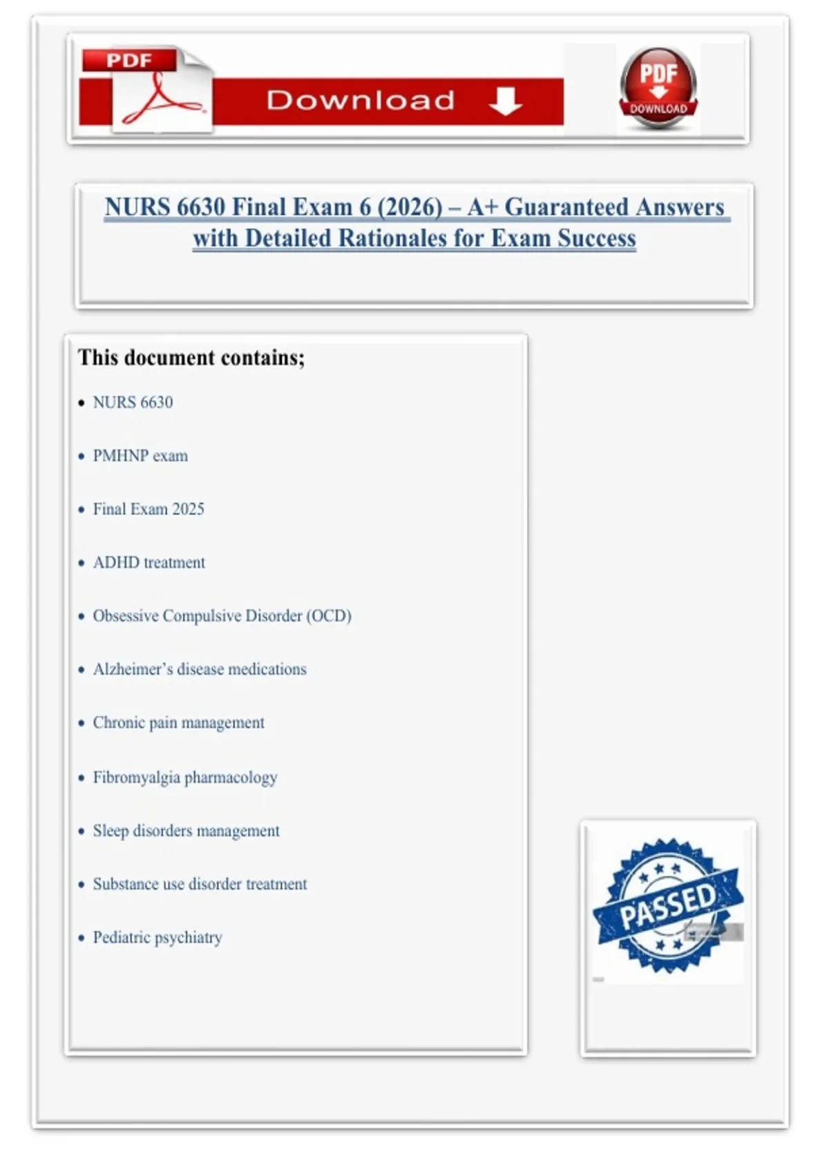 Ace your NURS 6630 Final Exam with this comprehensive, verified test bank for 2025! This resource includes detailed multiple-choice questions covering ADHD, OCD, Alzheimer’s, chronic pain, fibromyalgia, sleep disorders, substance use, pediatric and adult psychiatry, and pharmacological interventions. Each question comes with correct answers and clear, detailed rationales, making it perfect for exam preparation, revision, and concept mastery. Whether you’re studying stimulants, SSRIs, SNRIs, mood stabilizers, or antipsychotics, this guide ensures A+ success and confidence in your PMHNP knowledge.