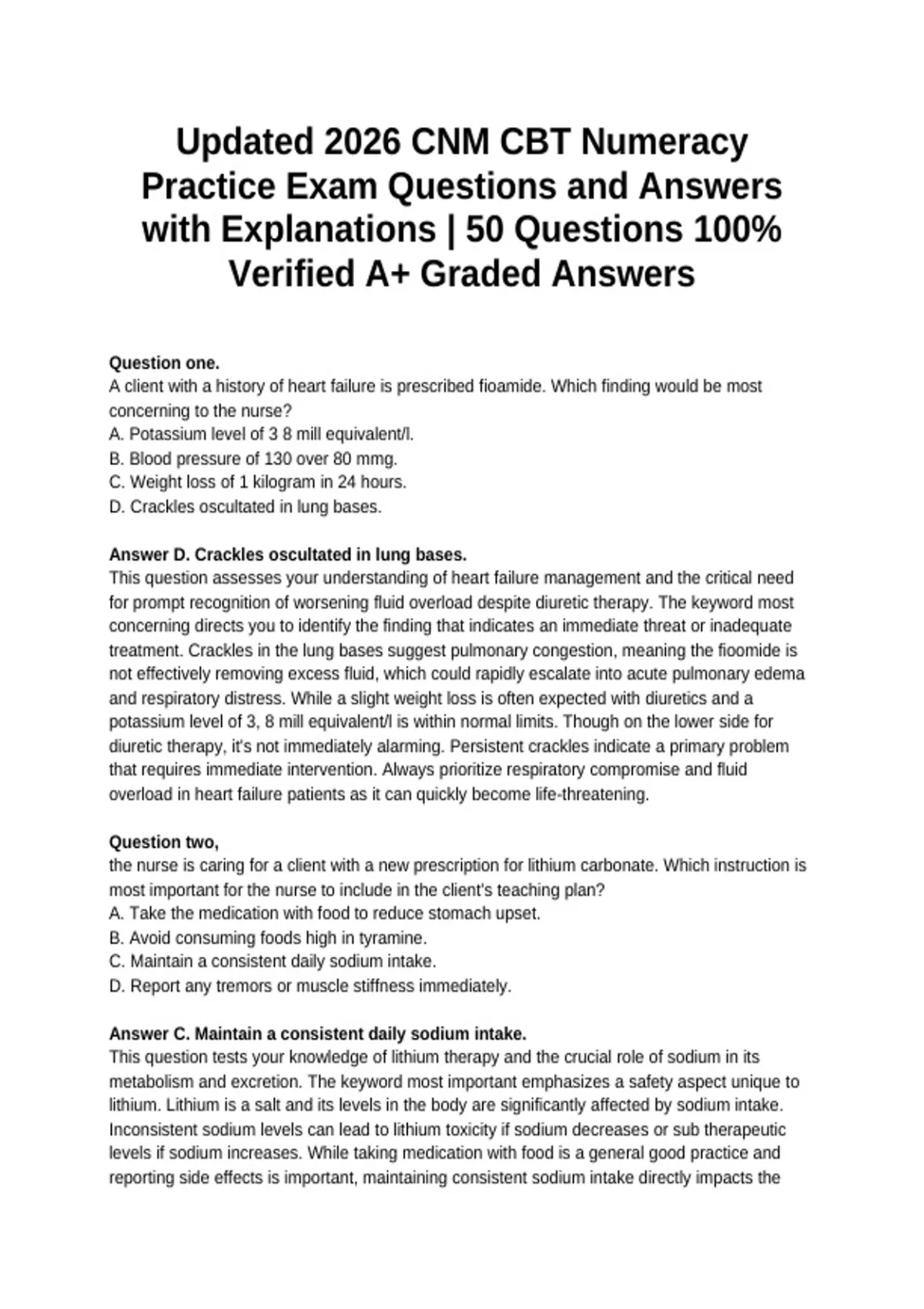 This document provides a complete CNM CBT Numeracy practice exam featuring 50 expertly reviewed questions with 100% verified, A+ graded correct answers and clear, step-by-step explanations. It focuses on key numeracy skills tested in the NMC CBT, including drug calculations, dosage conversions, IV rates, percentages, and patient safety calculations, making it an essential study resource for NMC CBT exam preparation in 2026.