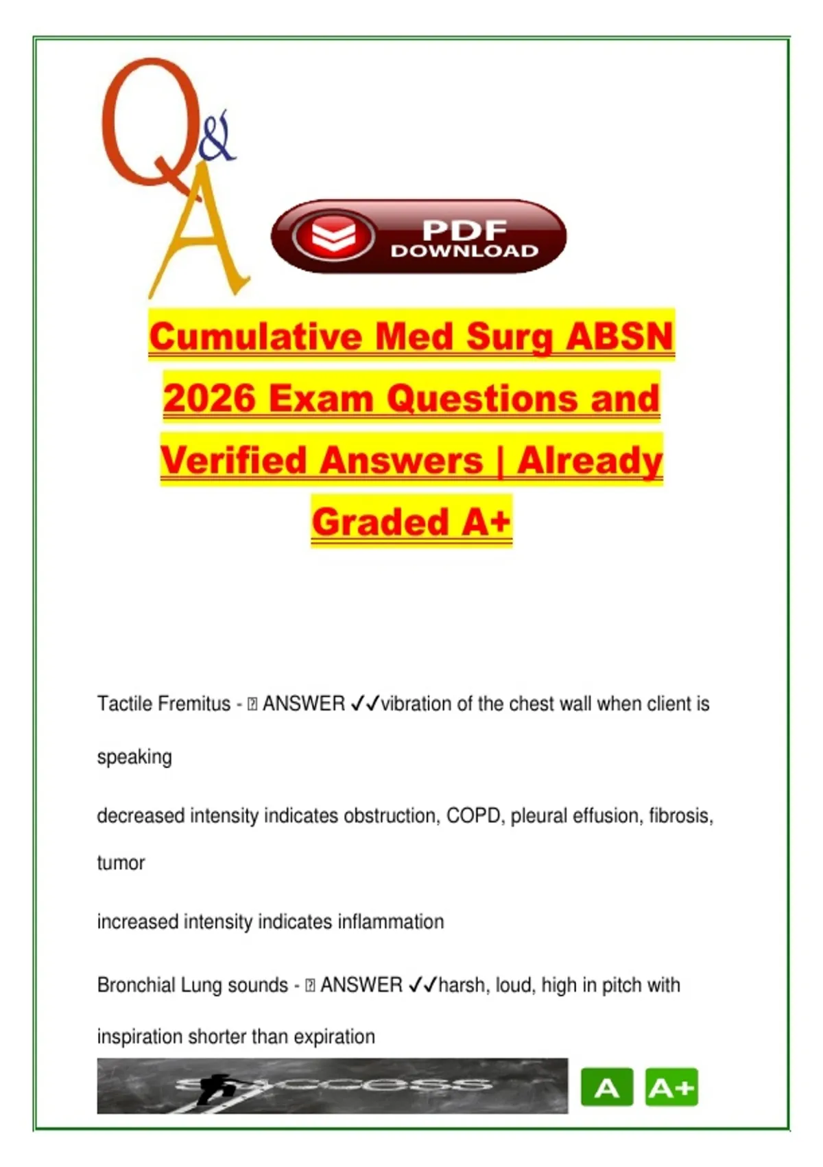 This expert-verified document is a comprehensive, cumulative question-and-answer resource designed for students in Accelerated Bachelor of Science in Nursing (ABSN) programs preparing for Medical-Surgical Nursing exams. With over 600 questions, this guide thoroughly covers a wide range of adult health topics aligned with core med-surg nursing curriculum and clinical decision-making. The content spans essential systems such as cardiovascular, respiratory, neurological, renal, endocrine, gastrointestinal, hematologic, and musculoskeletal, along with critical areas like fluid and electrolyte balance, infection control, acid-base regulation, and organ-specific disorders. You’ll find detailed explanations of diagnostic values, patient symptoms, treatment protocols, drug mechanisms (e.g., diuretics, insulin types, cardiac meds, antineoplastics), emergency interventions (shock, sepsis bundles, transfusion reactions), and care for chronic conditions like heart failure, COPD, diabetes, and kidney disease. Also included are in-depth rationales for interpreting ECG changes, ABG results, and vital signs, plus coverage of nursing procedures such as chest tube management, IV therapy complications, infection precautions, and nutritional modifications. Recommended for students in: ABSN and Traditional BSN Programs NCLEX-RN Preparation Courses Medical-Surgical Clinical Rotations Adult Health and Complex Nursing Practice Courses This document is an all-in-one review tool suitable for quizzes, midterms, finals, and board exams. Whether you are catching up, reviewing before clinicals, or prepping for the NCLEX, this Q&A guide offers clarity, structure, and depth in every section. Keywords: medical surgical nursing, ABSN exam prep, NCLEX review, nursing pharmacology, electrolyte imbalances, cardiovascular disorders, respiratory assessment, endocrine system, IV complications, nursing labs, insulin types, med-surg flashcards, sepsis treatment, cardiac medications, renal failure care, nursing diagnoses
