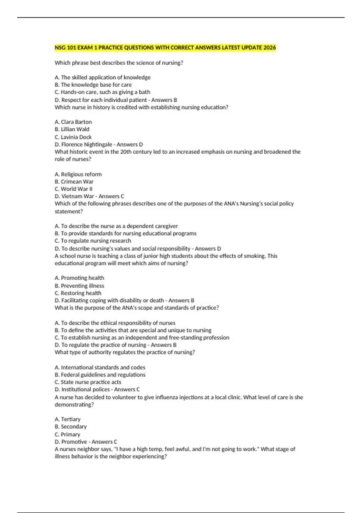 NSG 101 EXAM 1 PRACTICE QUESTIONS WITH CORRECT ANSWERS LATEST UPDATE 2026 Which phrase best describes the science of nursing? A. The skilled application of knowledge B. The knowledge base for care C. Hands-on care, such as giving a bath D. Respect for each individual patient - Answers B Which nurse in history is credited with establishing nursing education? A. Clara Barton B. Lillian Wald C. Lavinia Dock D. Florence Nightingale - Answers D What historic event in the 20th century led to an increased emphasis on nursing and broadened the role of nurses? A. Religious reform B. Crimean War C. World War II D. Vietnam War - Answers C Which of the following phrases describes one of the purposes of the ANA's Nursing's social policy statement? A. To describe the nurse as a dependent caregiver B. To provide standards for nursing educational programs C. To regulate nursing research D. To describe nursing's values and social responsibility - Answers D A school nurse is teaching a class of junior high students about the effects of smoking. This educational program will meet which aims of nursing? A. Promoting health B. Preventing illness C. Restoring health D. Facilitating coping with disability or death - Answers B What is the purpose of the ANA's scope and standards of practice? A. To describe the ethical responsibility of nurses B. To define the activities that are special and unique to nursing C. To establish nursing as an independent and free-standing profession D. To regulate the practice of nursing - Answers B What type of authority regulates the practice of nursing? A. International standards and codes B. Federal guidelines and regulations C. State nurse practice acts D. Institutional polices - Answers C A nurse has decided to volunteer to give influenza injections at a local clinic. What level of care is she demonstrating? A. Tertiary B. Secondary C. Primary D. Promotive - Answers C