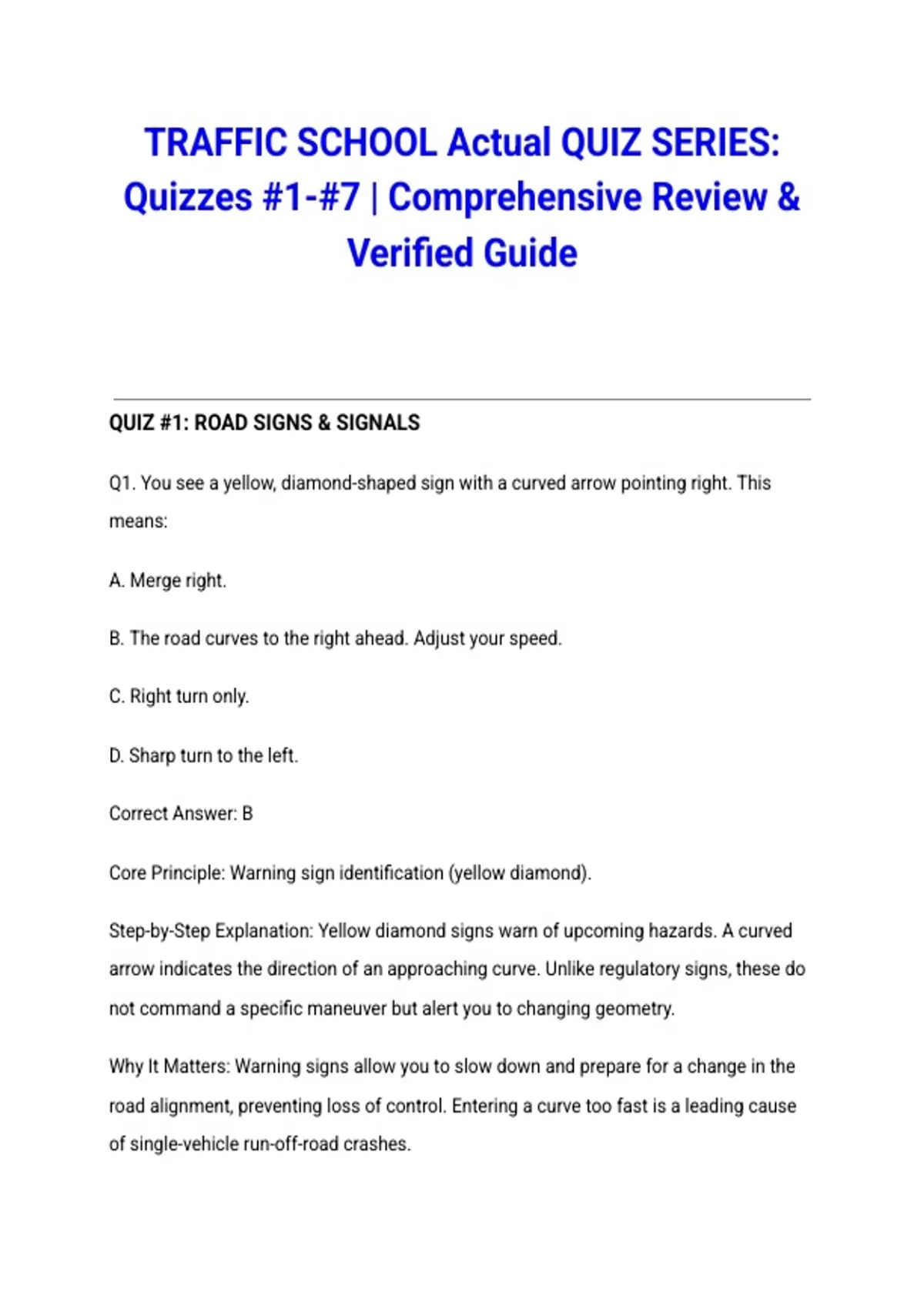 Prepare for your TRAFFIC SCHOOL Actual Quizzes #1-#7 with this comprehensive review series. This essential resource includes verified questions and answers covering traffic laws, defensive driving, and road safety regulations. Achieve quiz mastery and demonstrate driving safety competency with this targeted study guide.