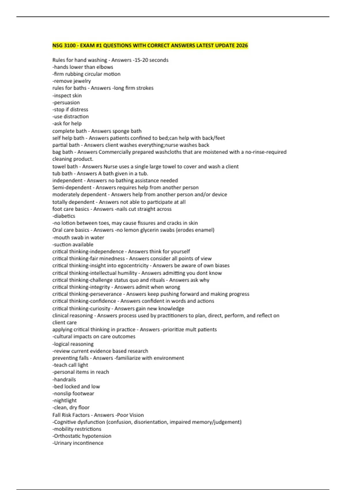 NSG 3100 - EXAM #1 QUESTIONS WITH CORRECT ANSWERS LATEST UPDATE 2026 Rules for hand washing - Answers -15-20 seconds -hands lower than elbows -firm rubbing circular motion -remove jewelry rules for baths - Answers -long firm strokes -inspect skin -persuasion -stop if distress -use distraction -ask for help complete bath - Answers sponge bath self help bath - Answers patients confined to bed;can help with back/feet partial bath - Answers client washes everything;nurse washes back bag bath - Answers Commercially prepared washcloths that are moistened with a no-rinse-required cleaning product. towel bath - Answers Nurse uses a single large towel to cover and wash a client tub bath - Answers A bath given in a tub. independent - Answers no bathing assistance needed Semi-dependent - Answers requires help from another person moderately dependent - Answers help from another person and/or device totally dependent - Answers not able to participate at all foot care basics - Answers -nails cut straight across -diabetics -no lotion between toes, may cause fissures and cracks in skin Oral care basics - Answers -no lemon glycerin swabs (erodes enamel) -mouth swab in water -suction available critical thinking-independence - Answers think for yourself critical thinking-fair minedness - Answers consider all points of view critical thinking-insight into egocentricity - Answers be aware of own biases critical thinking-intellectual humility - Answers admitting you dont know critical thinking-challenge status quo and rituals - Answers ask why critical thinking-integrity - Answers admit when wrong critical thinking-perseverance - Answers keep pushing forward and making progress critical thinking-confidence - Answers confident in words and actions critical thinking-curiosity - Answers gain new knowledge clinical reasoning - Answers process used by practitioners to plan, direct, perform, and reflect on client care applying critical thinking in practice - Answers -prioritize mult patients -cultural impacts on care outcomes -logical reasoning -review current evidence based research preventing falls - Answers -familiarize with environment -teach call light -personal items in reach -handrails -bed locked and low -nonslip footwear -nightlight -clean, dry floor Fall Risk Factors - Answers -Poor Vision -Cognitive dysfunction (confusion, disorientation, impaired memory/judgement) -mobility restrictions -Orthostatic hypotension -Urinary incontinence -Weakness -sedatives, hypnotics, tranquilizers, narcotic analgesics, and diuretics Seizure precautions - Answers -padded side rails -suction working and available -clear area -lower to ground -check mouth -observe movements & time -turn on side -anti-seizure medications Poisoining - Answers -proper labels -no poisonous plants -poison control number restraints - Answers -only if needed:last resort -every 24 hours -lowest level restraint first -continuous monitoring -do not impede circulation -quick release knot -never to handrails belt restraint - Answers seatbelt jacket restraint - Answers jacket used to restrain pt - last resort mitt restraint - Answers -restrict finger movement -prevents the person from grasping tubes or catheters -allows for more freedom of arm movement than a wrist restraint wrist or ankle restraint - Answers -pad bony promineces -movable portion of bedframe -2 fingers Moving patients - Answers -Safety is first priority -Ask patient to help as much as possible -Determine if patient comprehends what is expected -Determine patient's comfort level -Determine if you need assistance in moving the patient -bed to center of gravity -prevent spinal twisting-pivot technique -wide stance log roll - Answers -the method used to turn a patient with a spinal injury, in which the patient is moved to the side in one motion -arms across chest -blanket underneath slide to edge of bed -staff on both sides of the bed -supportive devices -pillow placed for side rolling (head)