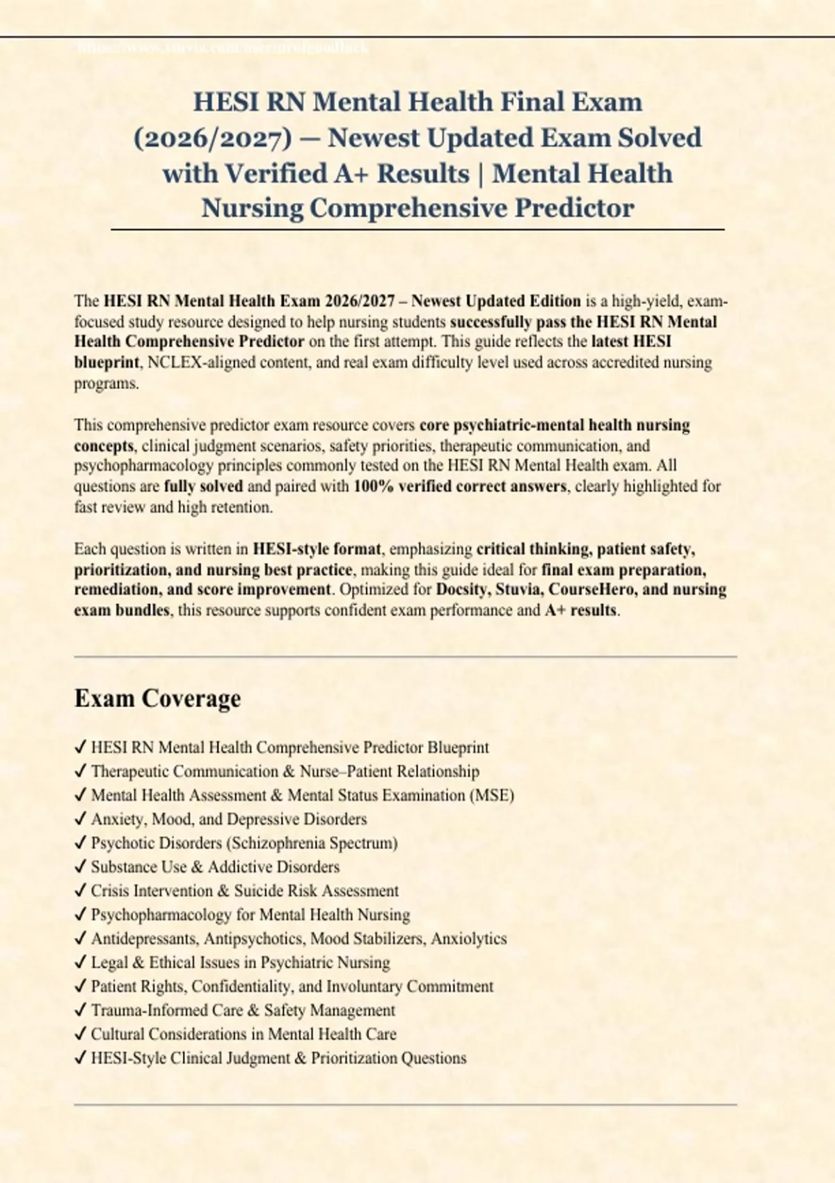 The HESI RN Mental Health Exam 2026/2027 – Newest Updated Edition is a high-yield, exam-