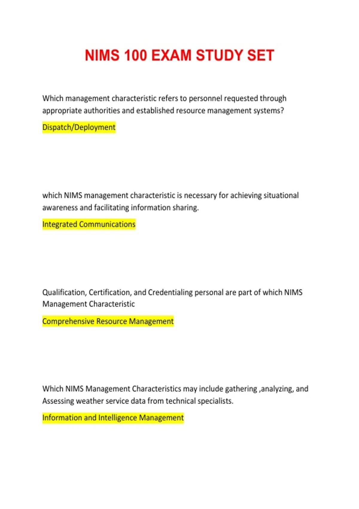 Page 1 of 13 NIMS 100 EXAM STUDY SET NIMS 100 EXAM STUDY SET