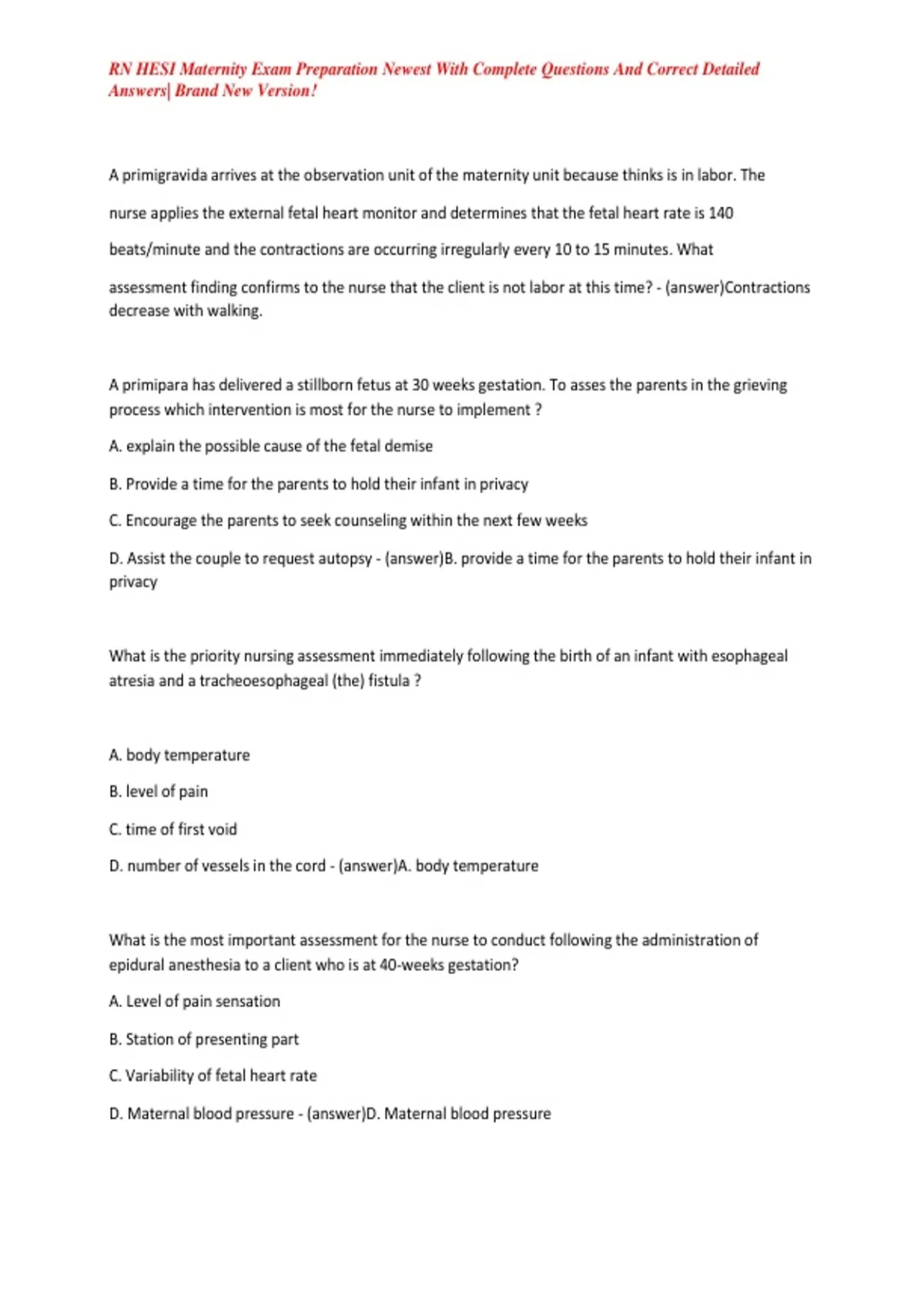 RN HESI Maternity Exam Preparation Newest With Complete Questions And Correct Detailed