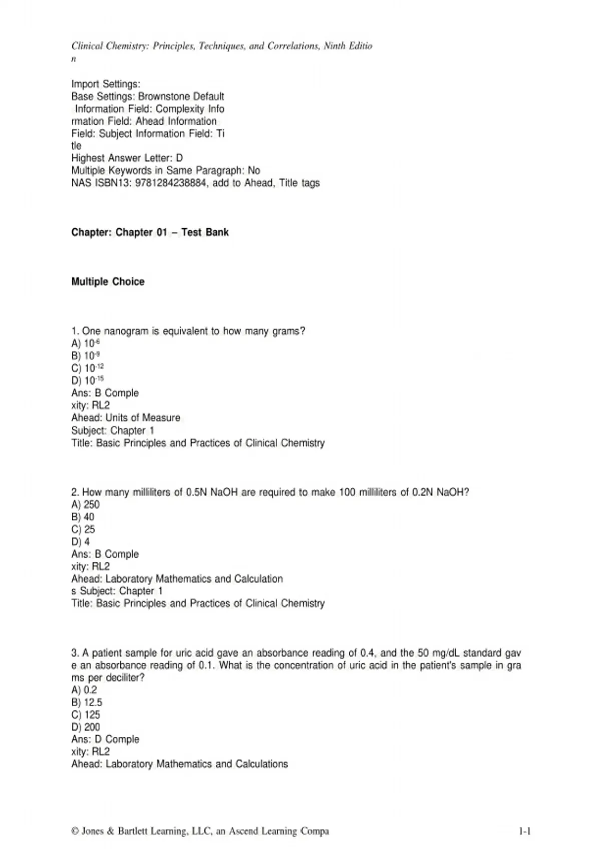Enhance your understanding of clinical chemistry with the Test Bank for Clinical Chemistry: Principles, Techniques, and Correlations, 9th Edition by Michael L. Bishop. This comprehensive test bank provides a complete collection of questions and answers designed to reinforce key principles and techniques in clinical chemistry. Ideal for students in medical laboratory science and related fields, this resource aids in effective exam preparation and deepens your grasp of vital laboratory concepts. Key Features: Complete test bank covering critical topics in clinical chemistry Varied question formats to assess comprehension Support for effective study strategies and exam readiness Essential resource for students and instructors in clinical laboratory sciences Prepare for your exams and solidify your knowledge of clinical chemistry principles and techniques with this indispensable test bank.