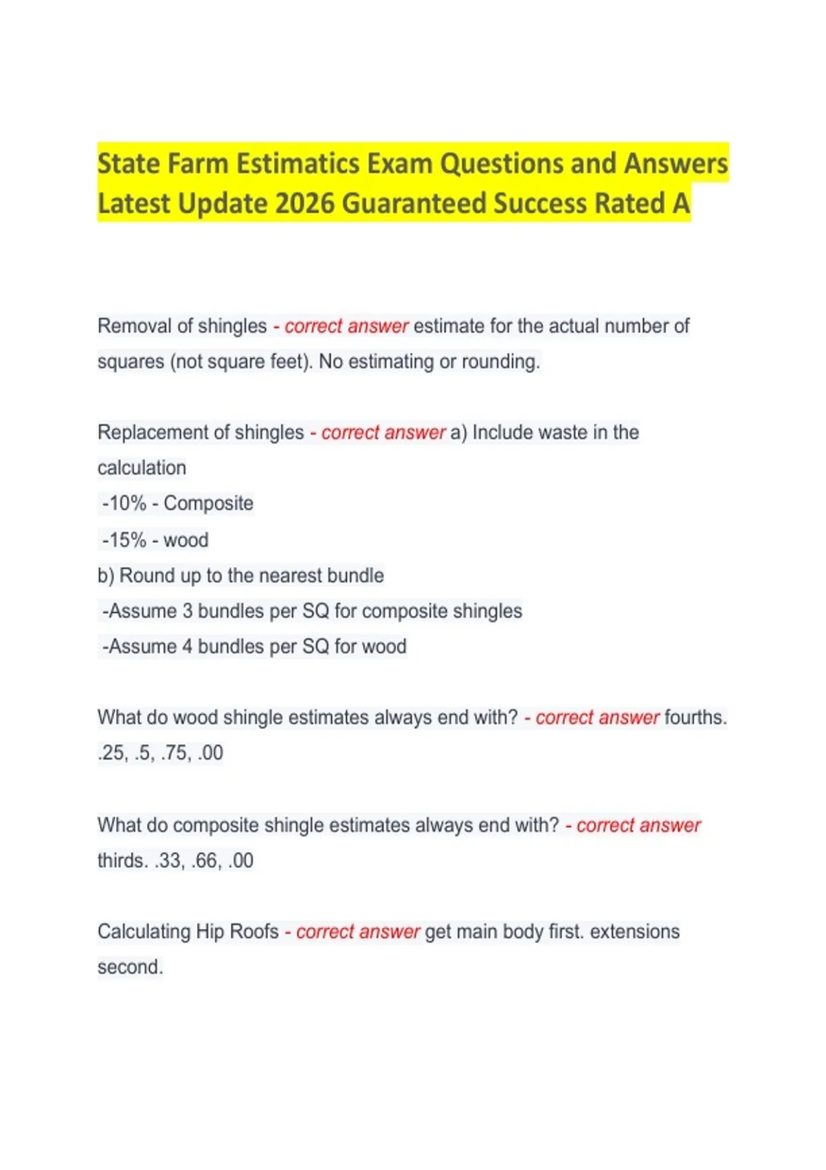 This document includes the latest updated State Farm Estimatics exam questions and answers for 2026, covering core topics such as auto damage estimating, repair procedures, parts pricing, labor calculations, and insurance claim standards. The questions are structured to reflect real exam formats and practical estimating scenarios used by State Farm. It is designed as a focused preparation resource for candidates seeking to strengthen accuracy, speed, and confidence ahead of the official Estimatics assessment.