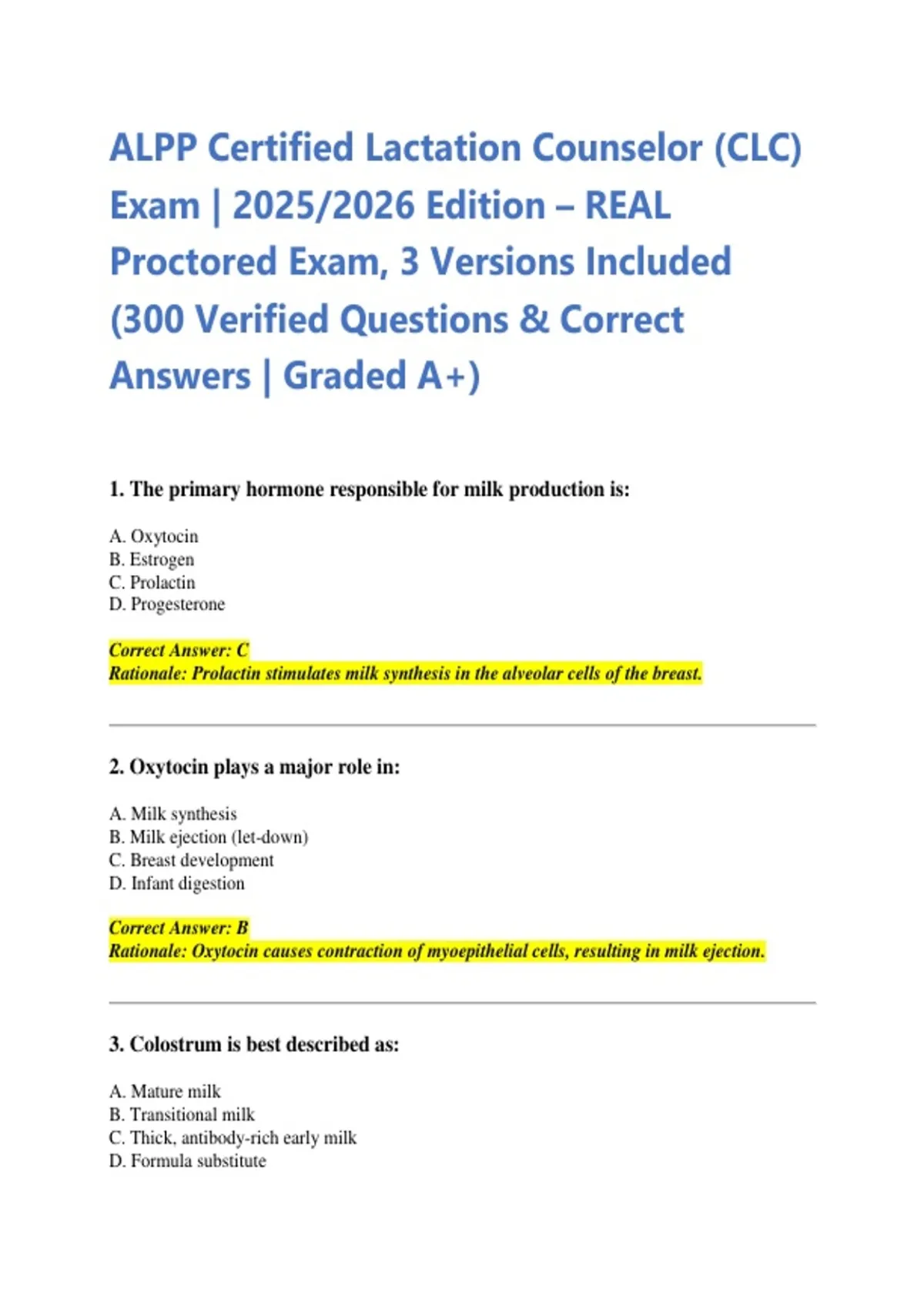 ALPP Certified Lactation Counselor (CLC) Exam | 2025/2026 Edition – REAL Proctored Exam, 3 Versions Included (300 Verified Questions & Correct Answers | Graded A+)