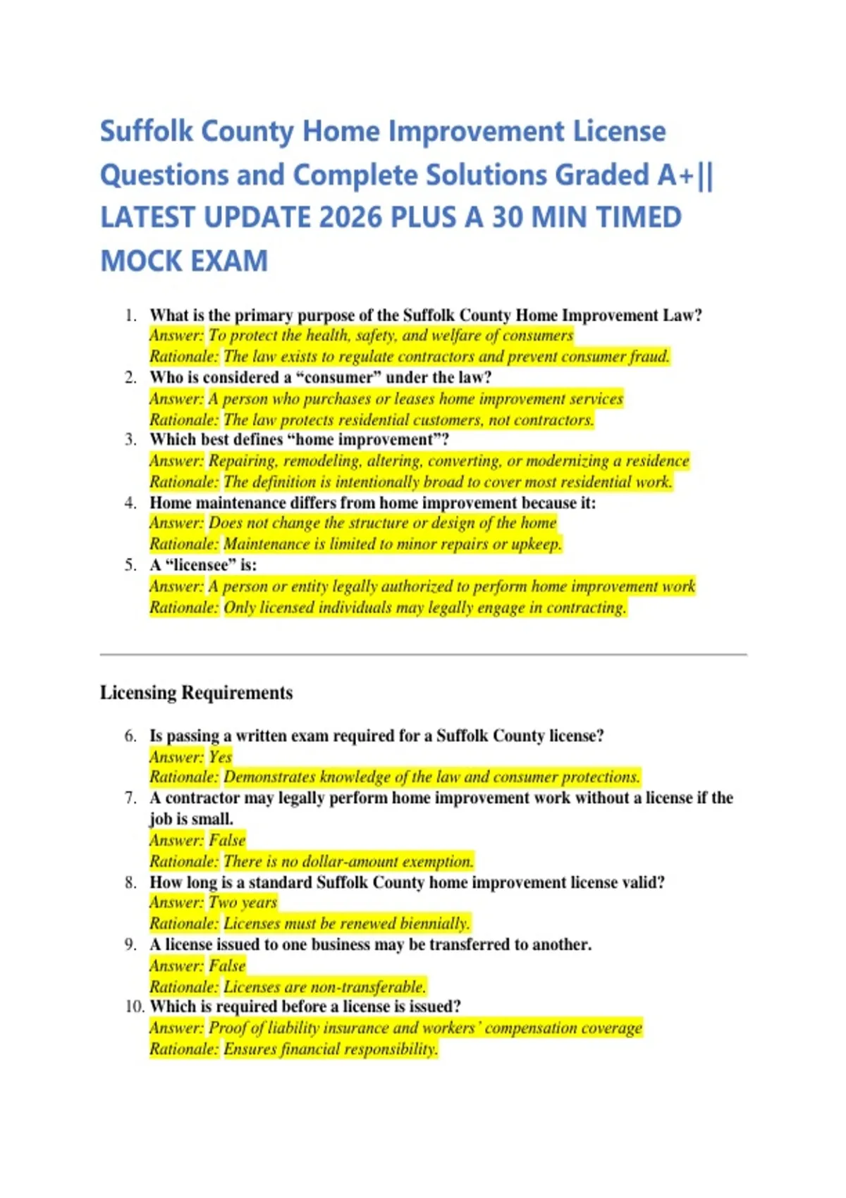 Suffolk County Home Improvement License Questions and Complete Solutions Graded A+|| LATEST UPDATE 2026 PLUS A 30 MIN TIMED MOCK EXAM