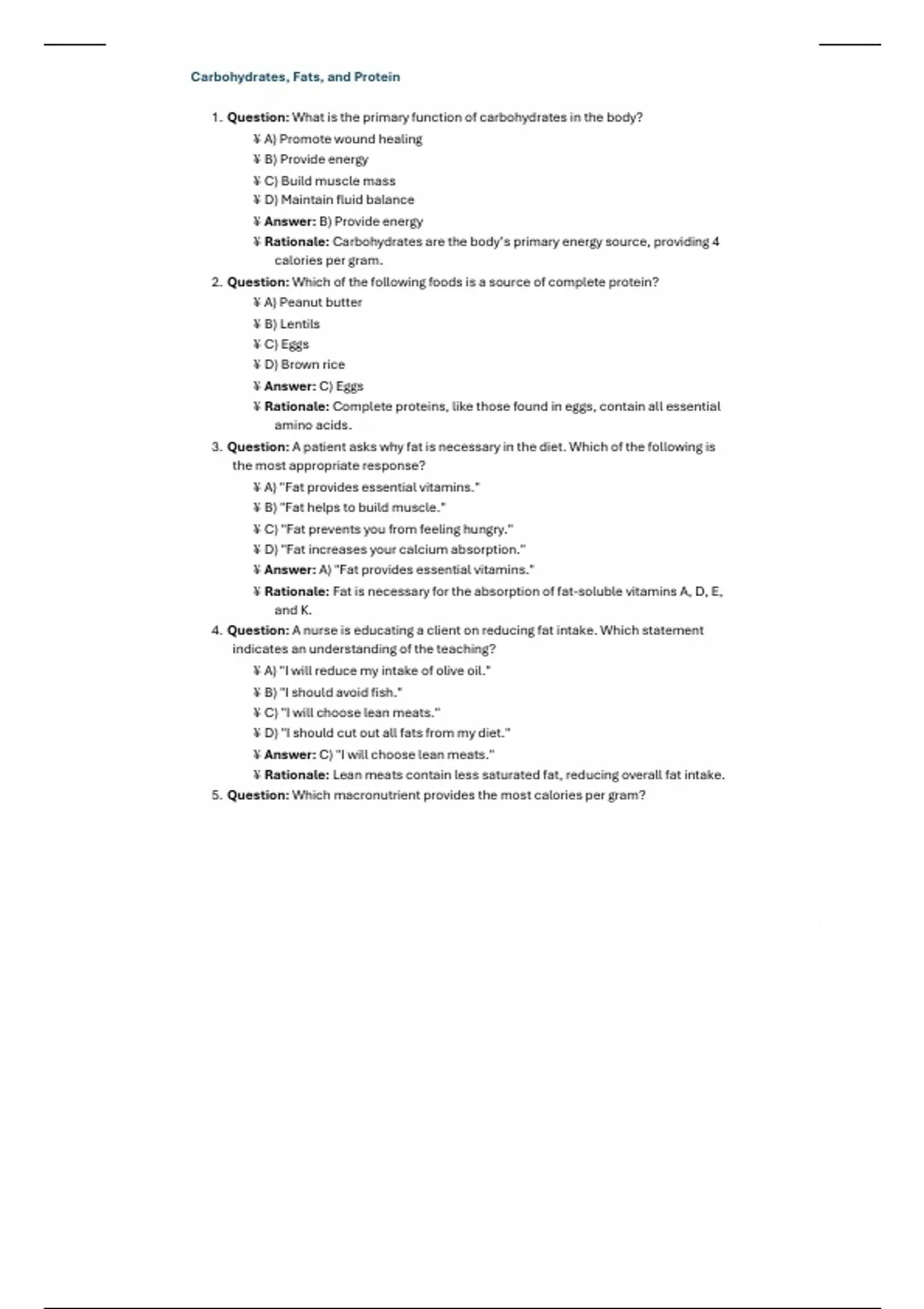 3. Question: A patient asks why fat is necessary in the diet. Which of the following is