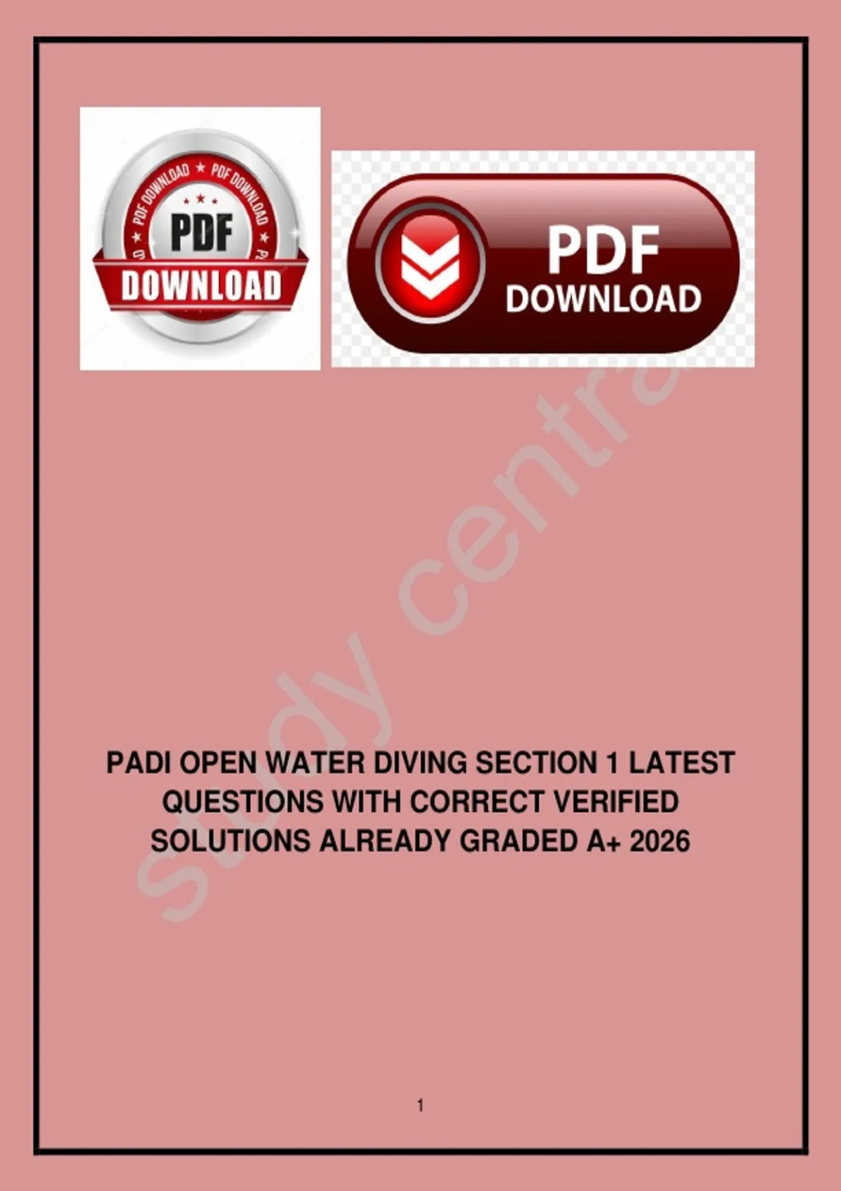INSTANT PDF DOWNLOAD This document focuses on Section 1 of the PADI Open Water Diver course, presenting the latest exam-style questions with fully verified correct solutions. It covers foundational topics such as basic dive principles, safety awareness, equipment introduction, and essential diving rules required for beginner-level understanding. The material is already graded A+ and is ideal for early exam preparation, revision, or reinforcing core knowledge before advancing to later sections.