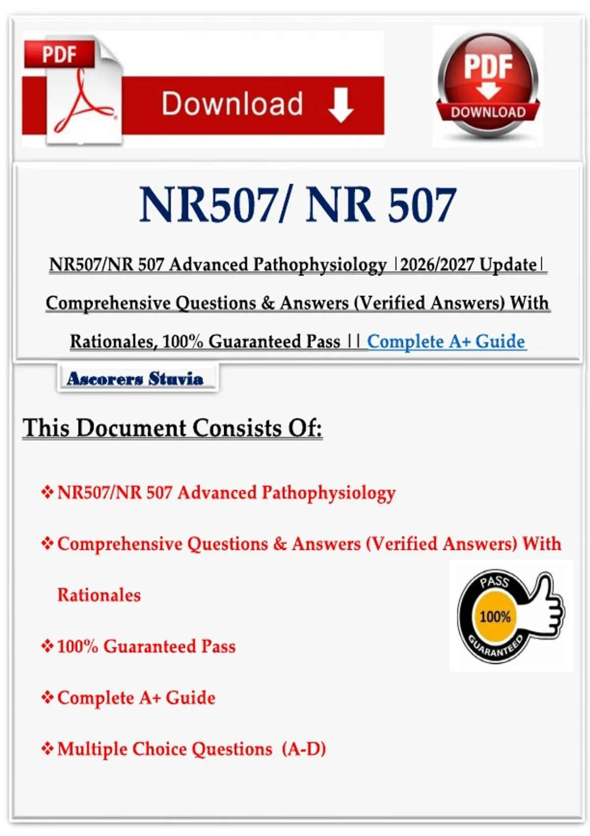 NR507/NR 507 Advanced Pathophysiology |2026/2027 Update| Comprehensive Questions & Answers (Verified Answers) With Rationales, 100% Guaranteed Pass || Complete A+ Guide. Ace your NR 507 Advanced Pathophysiology Midterm with this comprehensive test bank featuring 161 multiple-choice questions—all accompanied by detailed, easy-to-understand rationales. Designed for MSN, DNP, and APRN students, this resource covers essential topics including: Cardiovascular Pathophysiology – Heart failure, valvular disorders, hypertension, perfusion Renal & Urinary Systems – AKI, CKD, glomerulonephritis, renal failure, BPH Respiratory Disorders – Asthma, chronic bronchitis, COPD, respiratory acidosis Hematology – Anemia, polycythemia, hematopoiesis, erythropoiesis Immune & Inflammatory Responses – Glomerulonephritis pathogenesis, macrophage function Fluid & Electrolytes – ADH, aldosterone, angiotensin II, acid-base balance Why Choose This Guide? Perfect for Exam Prep – All questions are formatted like actual exam items with clear correct answers and explanations. Saves Study Time – Rationales help you understand why an answer is correct, reinforcing key concepts. Comprehensive Coverage – Based on the NR 507 curriculum, this guide ensures you’re prepared for every major topic. Digital & Printable – Use on any device or print for offline study. Ideal For: NR 507 Advanced Pathophysiology Students MSN & DNP Candidates Nurse Practitioner (NP) Exam Review Clinical Nurse Specialists Any Advanced Practice Nursing Student Tags: NR 507, Advanced Pathophysiology, Midterm Exam, Test Bank, MCQ with Rationales, MSN, DNP, APRN, Nurse Practitioner, Pathophysiology Study Guide, 2026, Quizlet Alternative, Exam Prep, Cardiac, Renal, Respiratory, Hematology, Immune System.