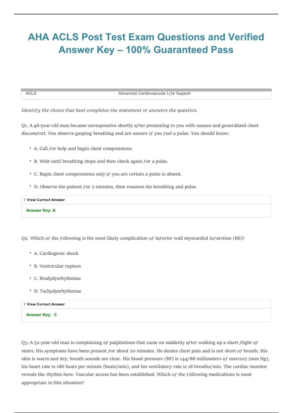 This document includes AHA ACLS post-test exam questions with a verified answer key to support certification review and skills reinforcement. It covers core ACLS concepts such as cardiac rhythms, pharmacology, algorithms, and emergency team response, making it a focused study resource for ACLS exam preparation.