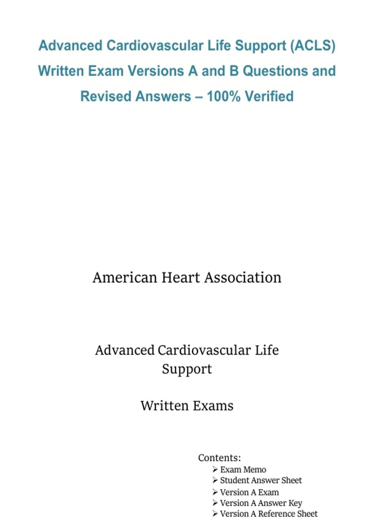This document contains the ACLS written exam questions for Versions A and B, accompanied by fully revised and 100% verified correct answers. It covers essential ACLS content including cardiac arrest algorithms, ECG rhythm interpretation, pharmacology, airway management, and team-based resuscitation, supporting thorough preparation for the 2026/2027 certification exams.