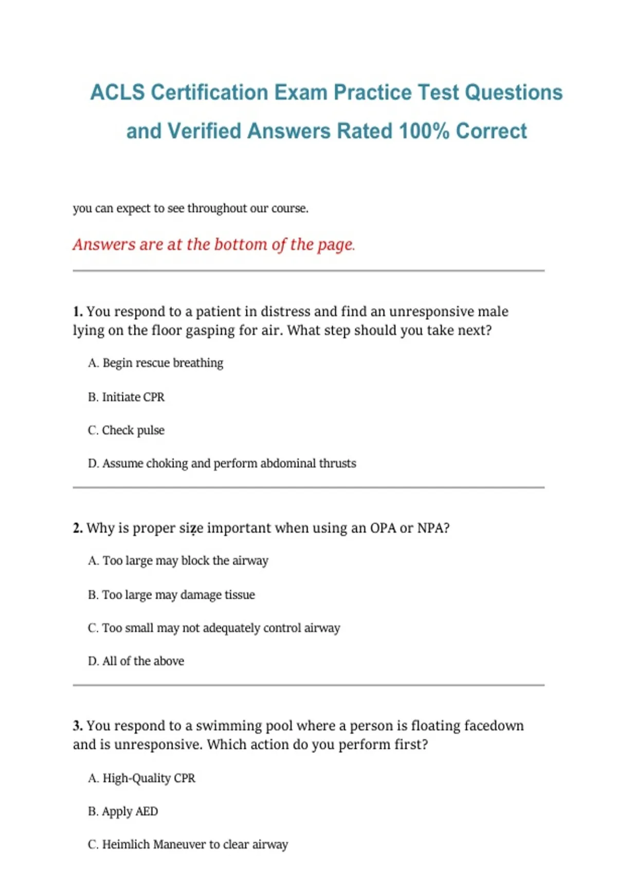 This practice test is designed for the ACLS Certification Exam and includes exam-style questions with fully verified, 100% correct answers. It reviews essential Advanced Cardiovascular Life Support concepts such as cardiac arrest algorithms, ECG rhythm interpretation, pharmacology, airway management, and team dynamics to support confident preparation for the 2026/2027 certification cycle.
